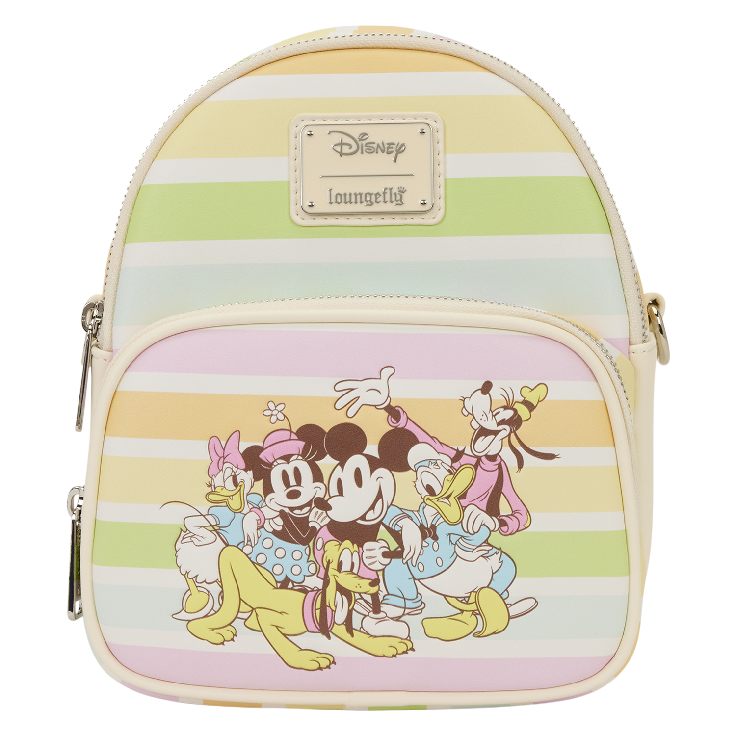 This mini backpack converts between a backpack and a crossbody bag. You'll find Mickey and his friends on the front pocket. The bag and the detachable straps are covered in pastel rainbow stripes. It's a super fun way to add some Disney magic to your day!