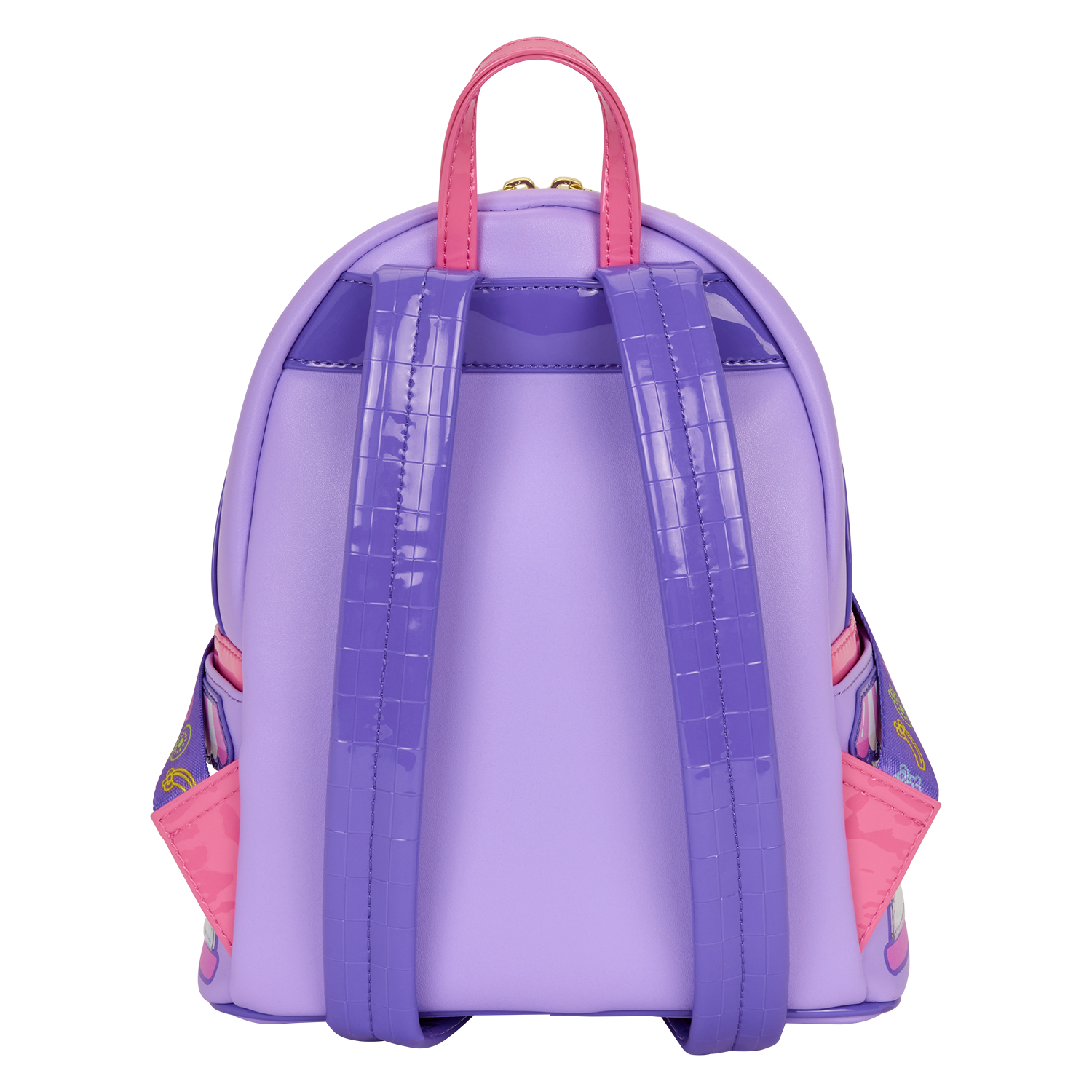 This bag looks like a storefront, complete with striped awning and windows through which you can see some of Hello Kitty's friends, including Cinnamoroll, My Melody, Tuxedo Sam, Pompompurin, Keroppi, and Kuromi! This bag comes with an exclusive Scented Hello Kitty Funko POP!, which fits within the bag so it looks like Hello Kitty is standing in the store! Patent faux leather, embroidery, and embossed details bring the whole look together.