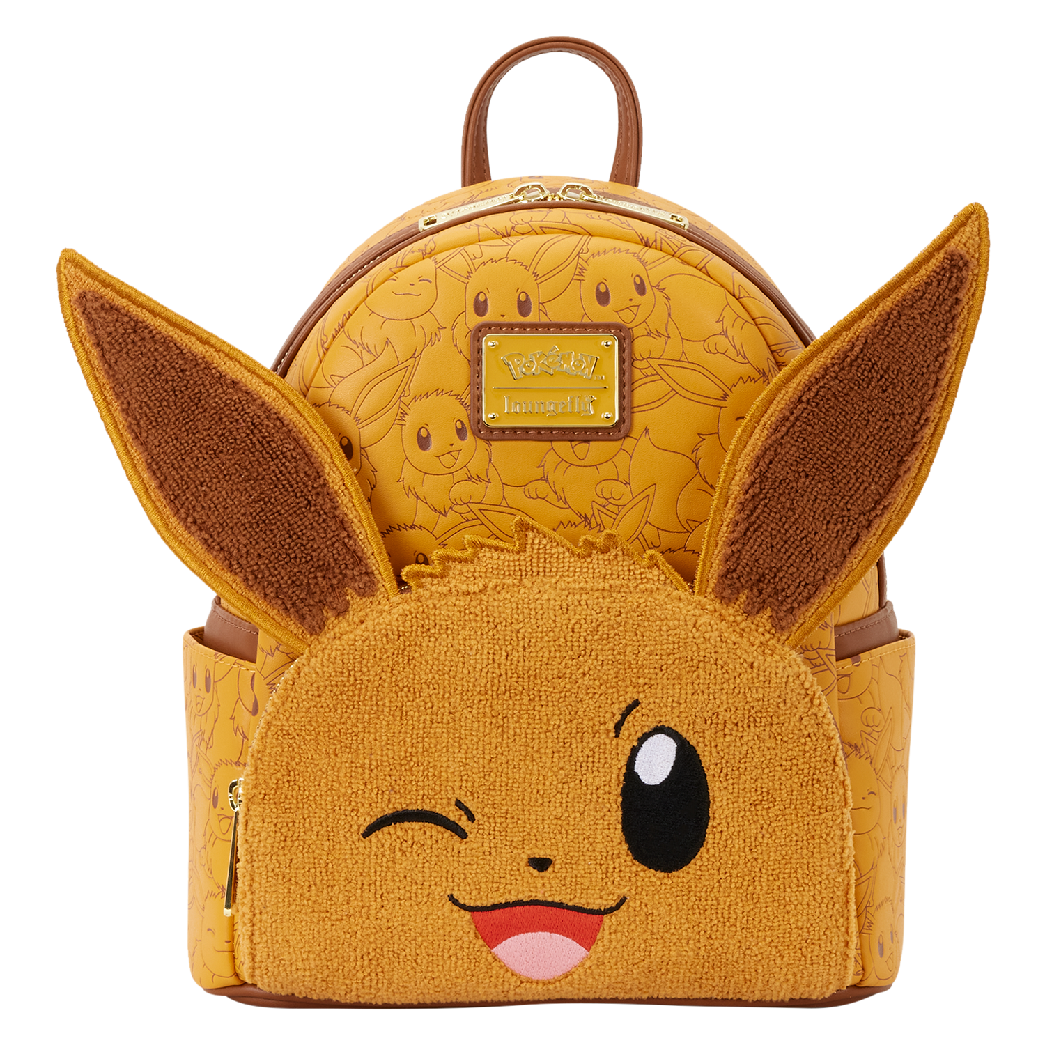 Eevee winks out from the front pocket. While Eevee's face is terry cloth, Eevee's ears are suede and 3D! On the rest of the bag, you'll find illustrations of Eevee all over.