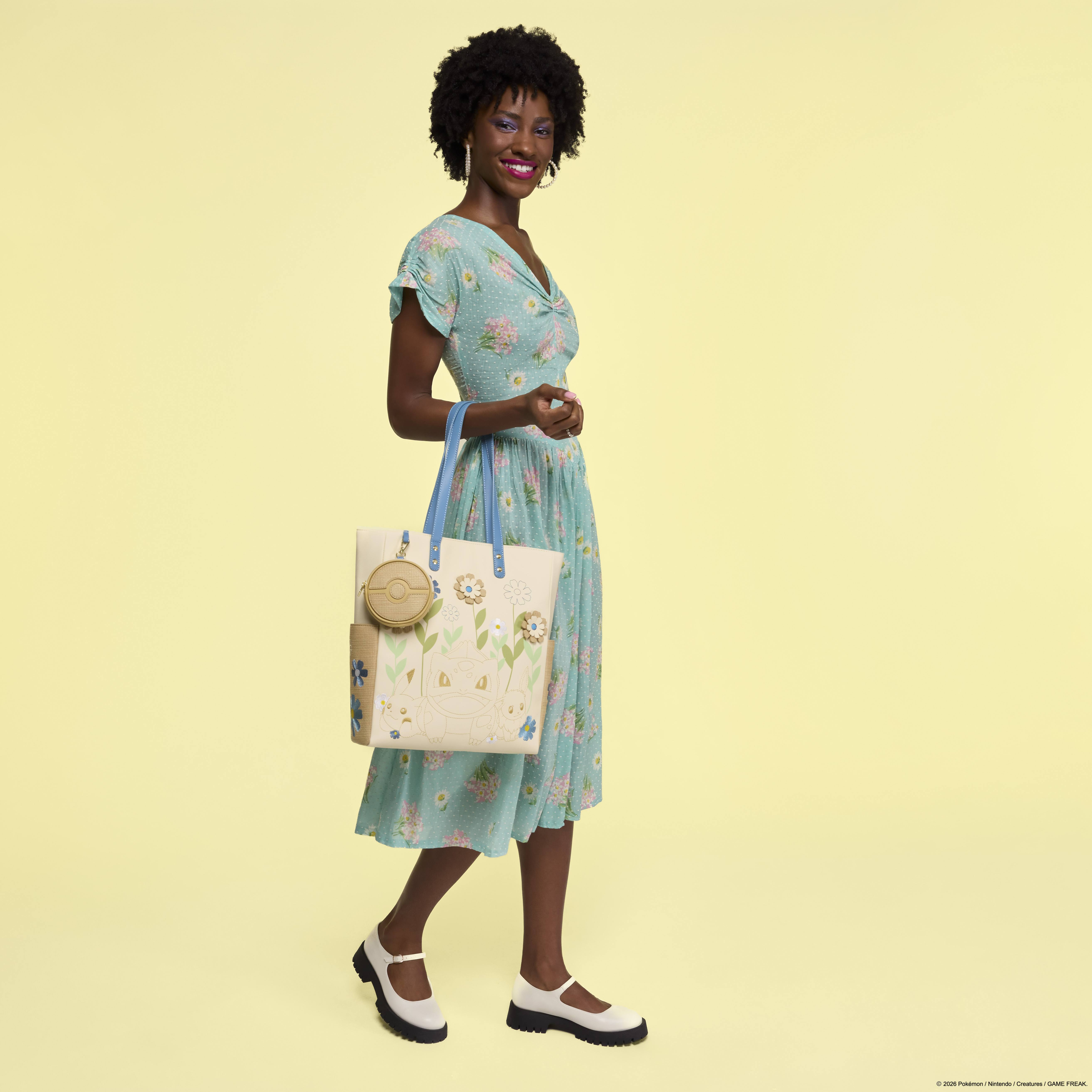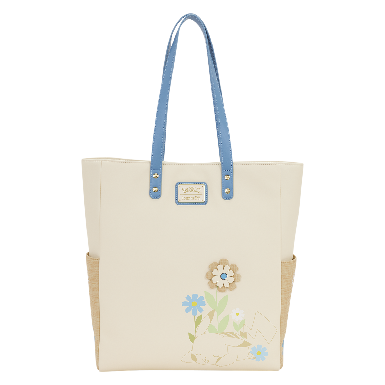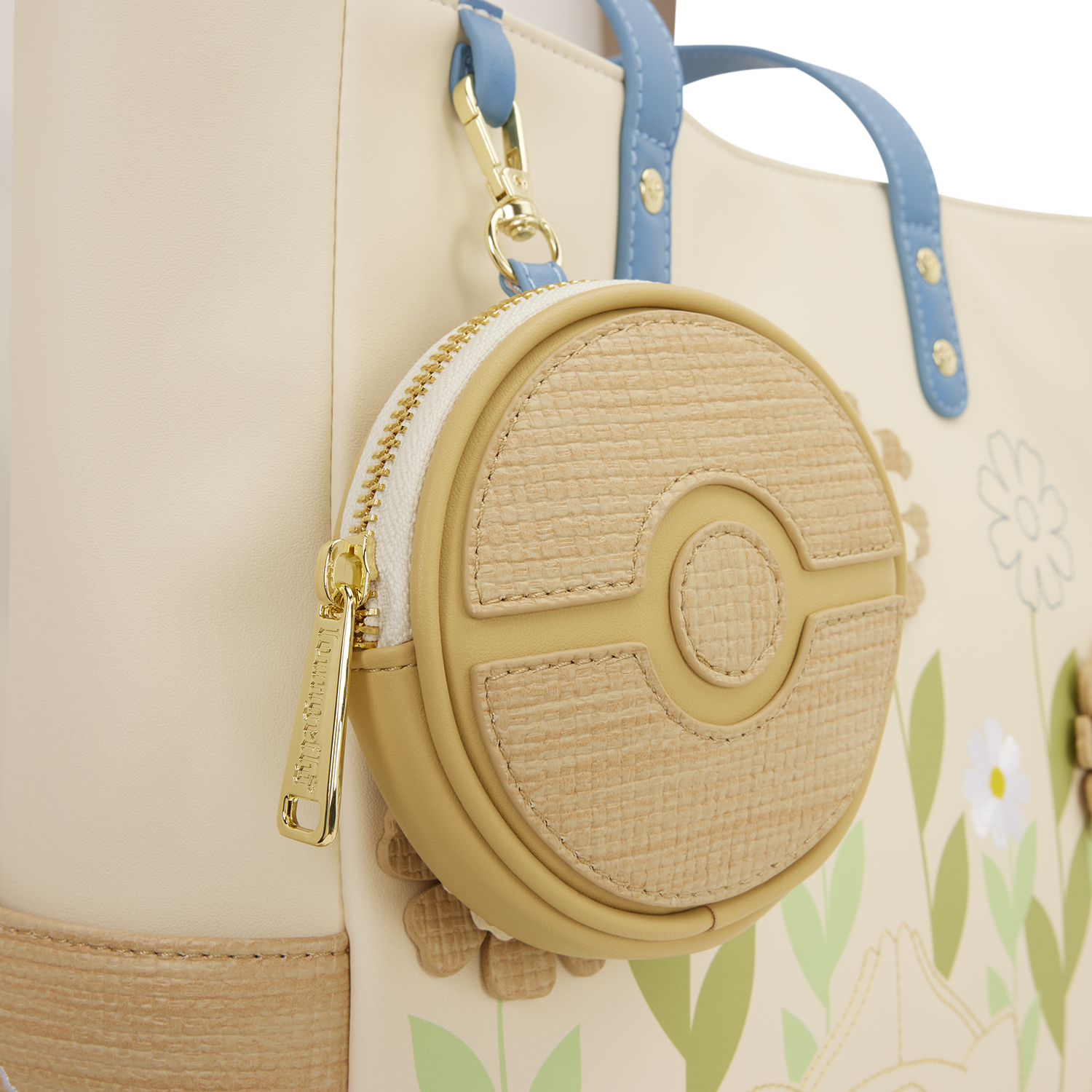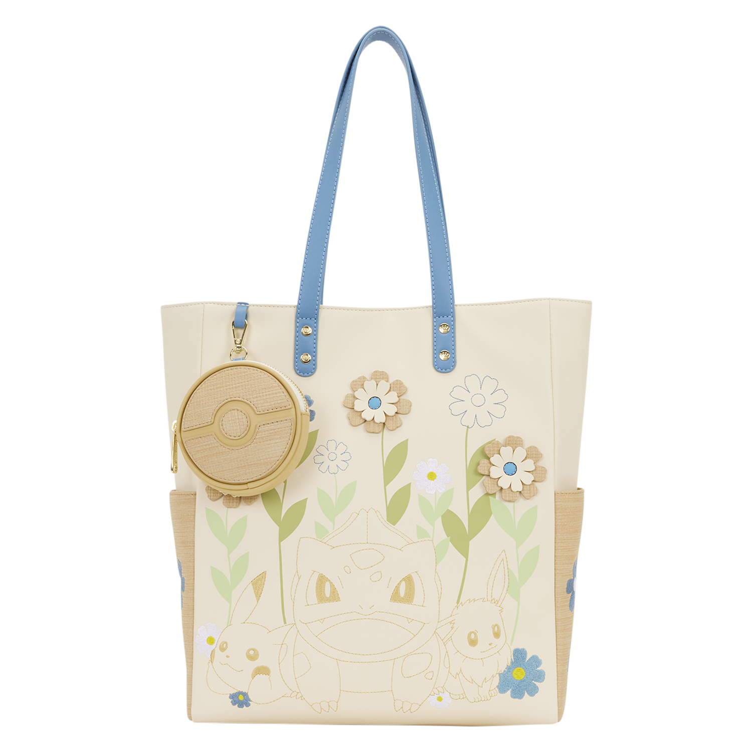 This tote features the outlines of some of your favorite Pokémon: Pikachu, Bulbasaur, and Eevee surrounded by flowers. You'll find woven details on the sides along with flowers. Attached to the bag is a detachable coin bag in the shape of a Poké Ball! Turn the bag around to find an adorable image of Pikachu sleeping amongst the flowers!