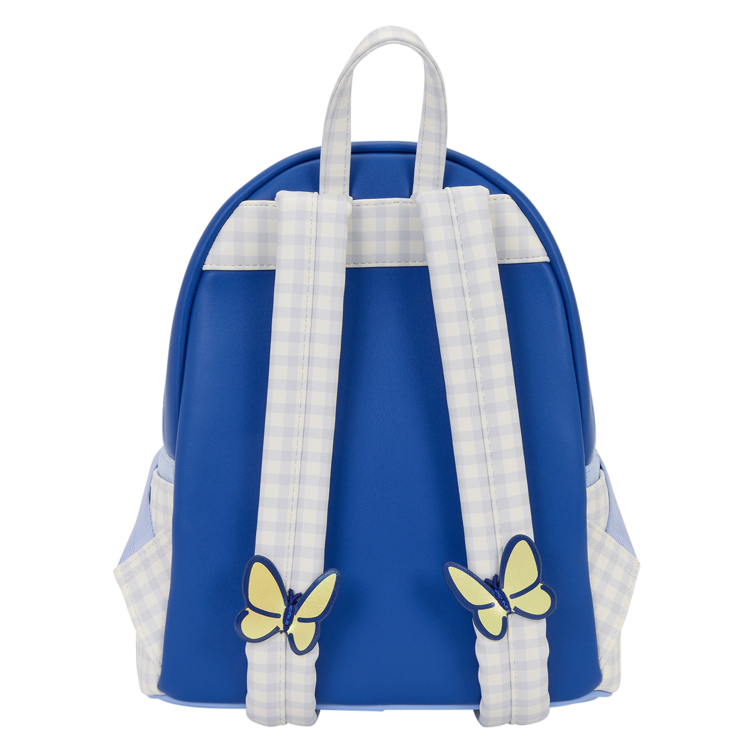 This adorable mini backpack is inspired by Pochacco! You'll find him on the front surrounded by butterflies! He also appears on the side pockets being oh-so-cute! On the front, you'll find that Pochacco's behind swings on a rivet! You'll find a light blue and white gingham pattern over the side pockets, top handle, and straps. Plus, there are iridescent applique butterflies attached to the straps!