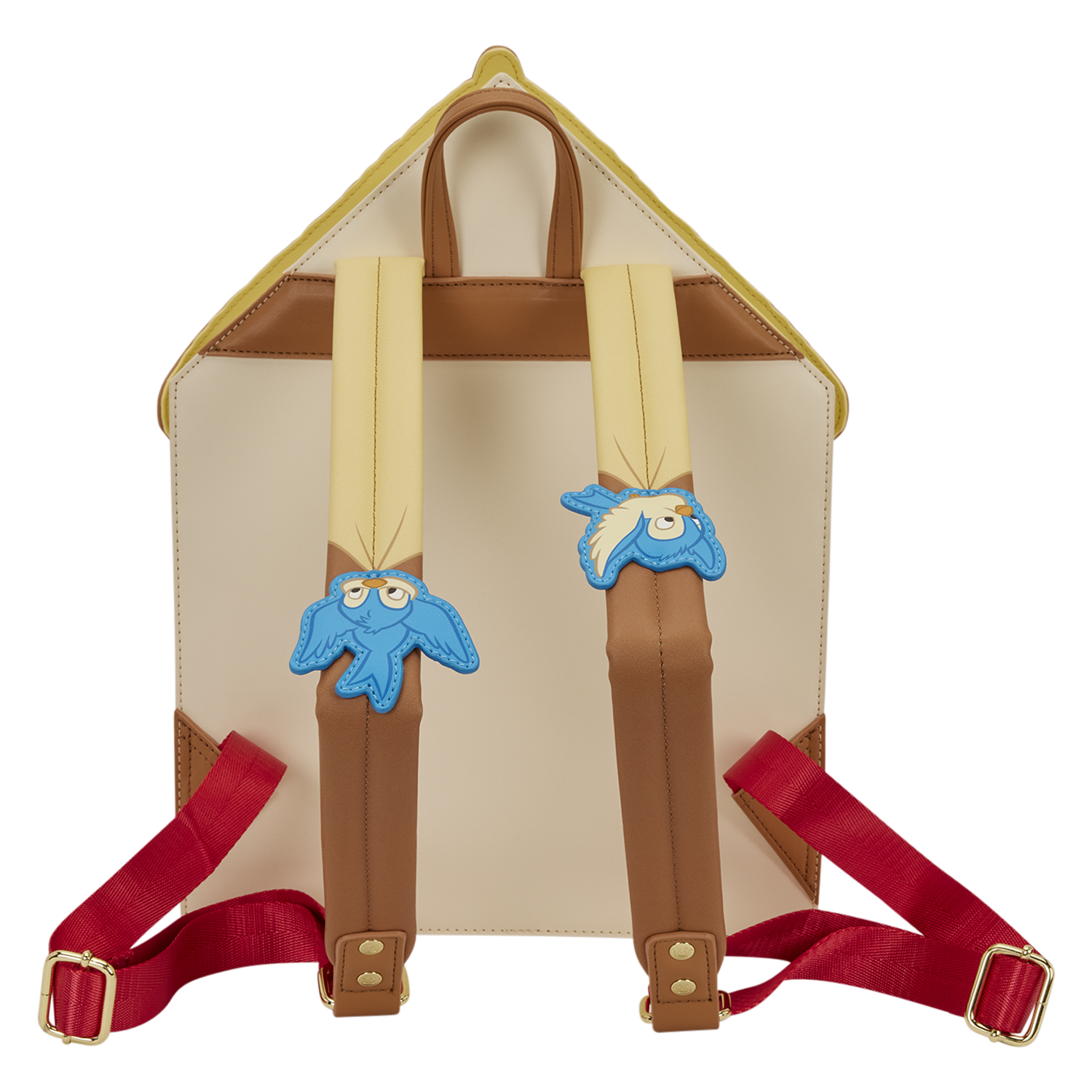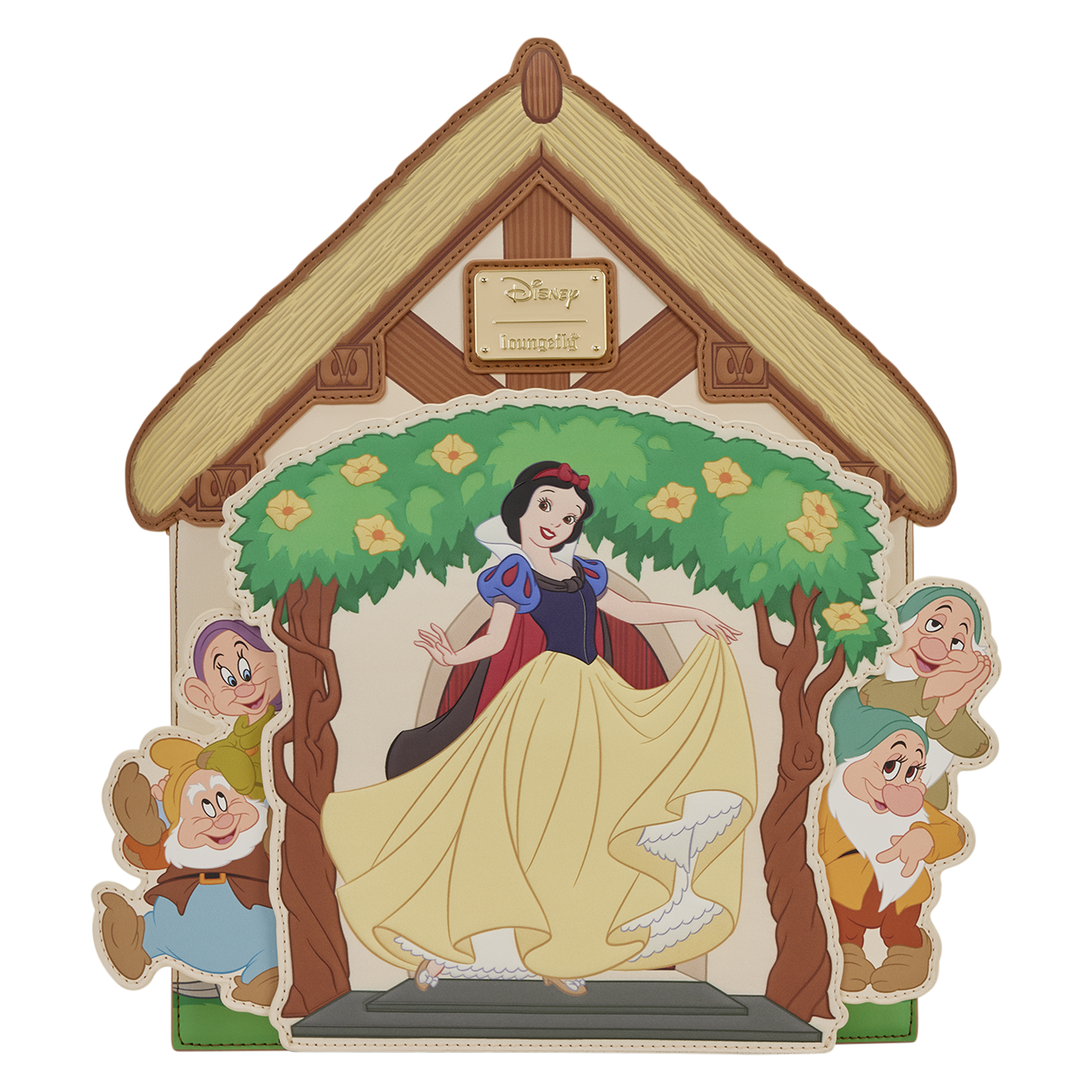 This bag is in the shape of the dwarfs’ cottage. Snow White stands just outside the front door, under a floral arch. On either side of her, appliques of the dwarfs can be pulled out to stand beside her! Find more illustrations of characters on the side pockets, and appliques of birds on the straps!