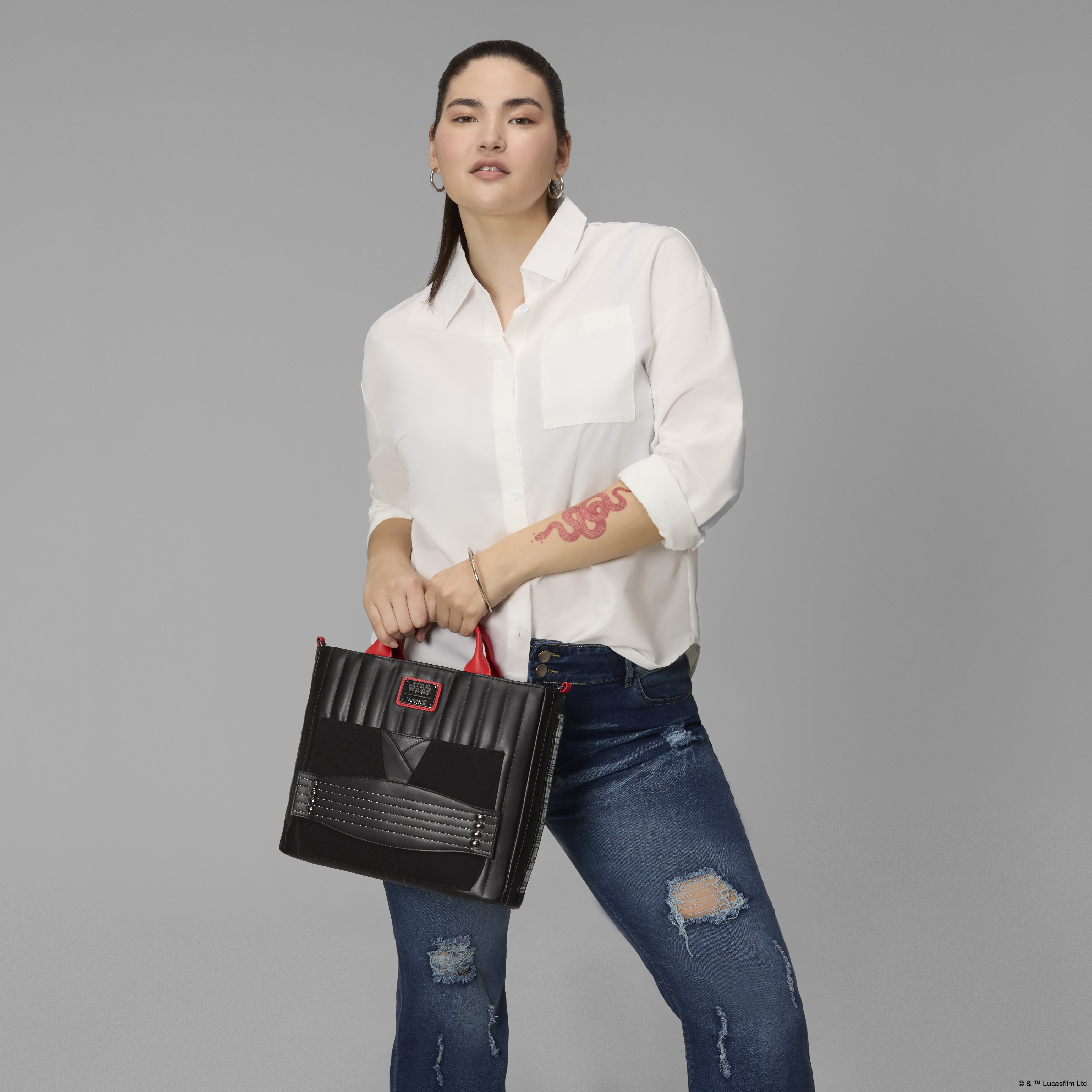 This bag is inspired by Darth Maul and converts between a backpack and a tote bag. You'll find details inspired by Darth Maul on the bag. Turn the bag around to find an embroidered Sith Eternal symbol on the back. You can find the same symbol in a repeating pattern along the straps. Take a look at the left side and find the hilt of Darth Maul's dual saber!