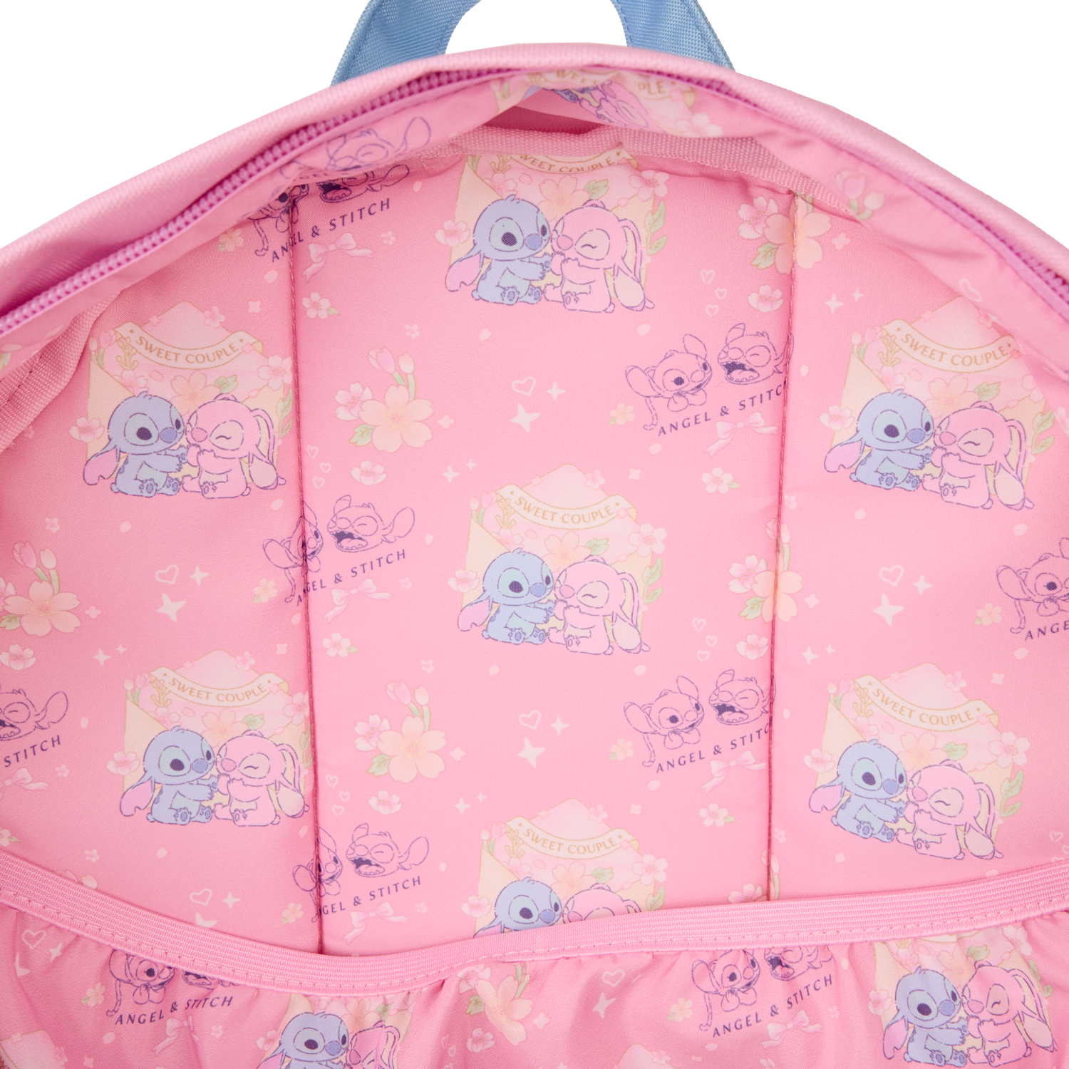 This full-size backpack features Stitch and Angel sitting together on a pink front pocket surrounded by flowers. The rest of the bag features an all-over print of pink flowers and some colour-blocked sections of pink and blue.