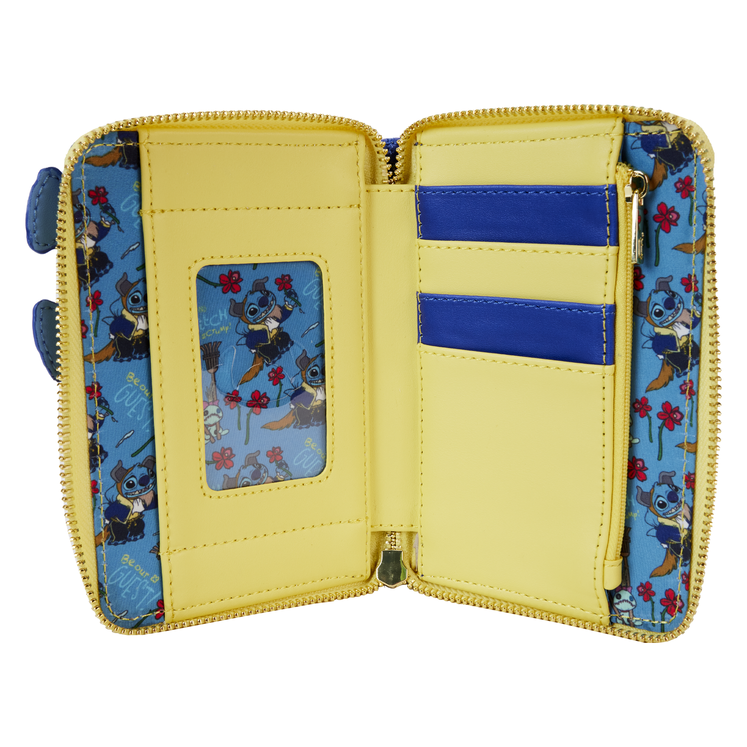 The Exclusive Loungefly Stitch in Beast Costume Zip Around Wallet is made of vegan leather (polyurethane). Wallet zips closed with shiny gold hardware. Additional features include a Stitch-shaped die-cut ID window and printed details. Take note of the coordinating inside lining.