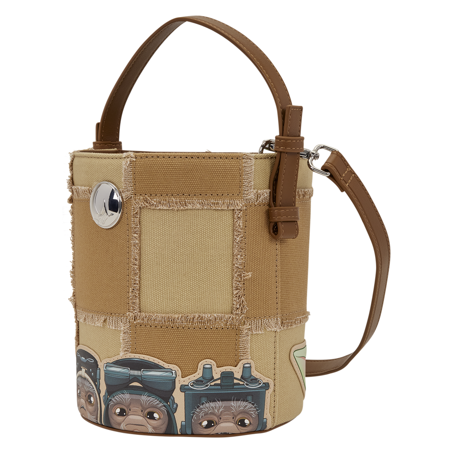 This bucket crossbody bag features a beige checkered pattern. On one side, you'll find Grogu at the bottom, smiling out from the bag. On the other side, you'll find several Anzellans standing together. This is a really fun statement piece to show off your love for the STAR WARS™ universe!