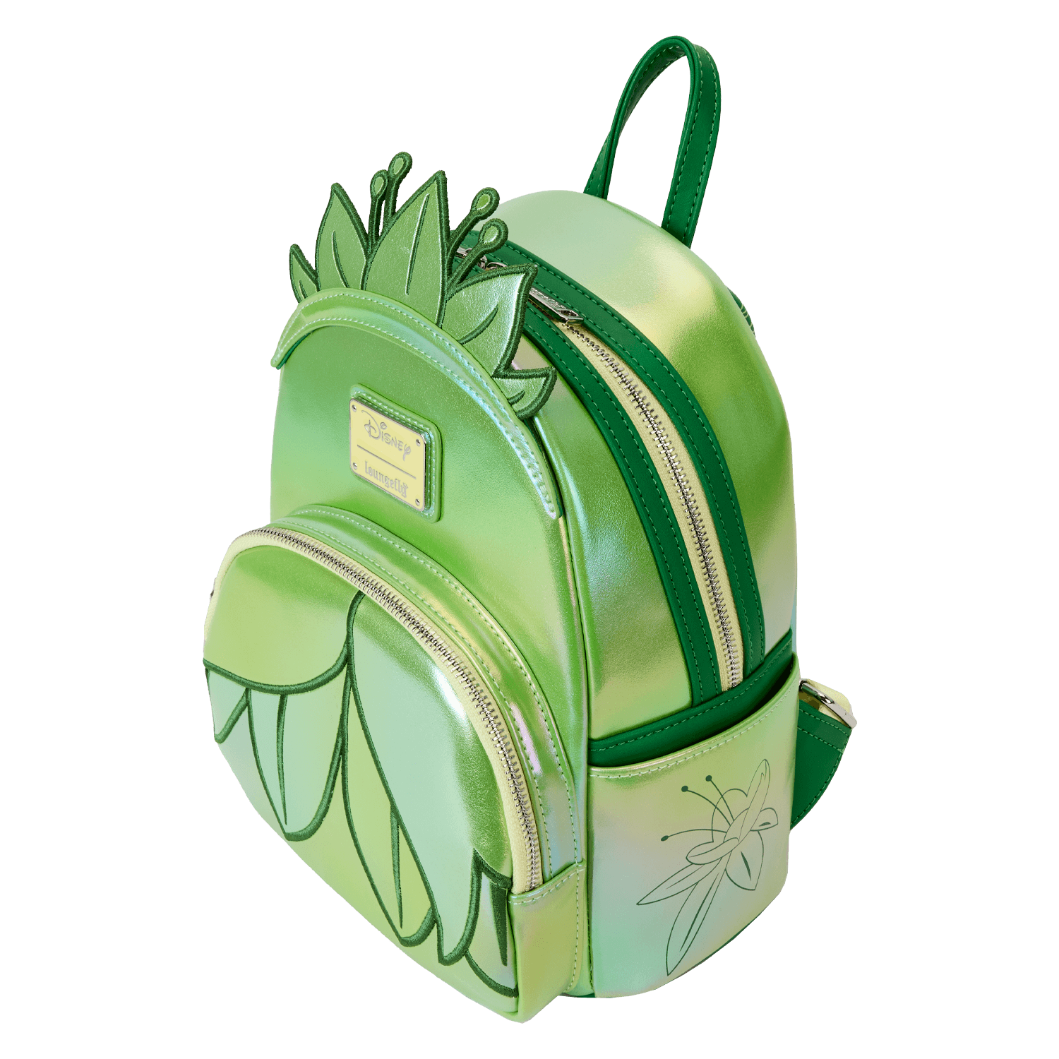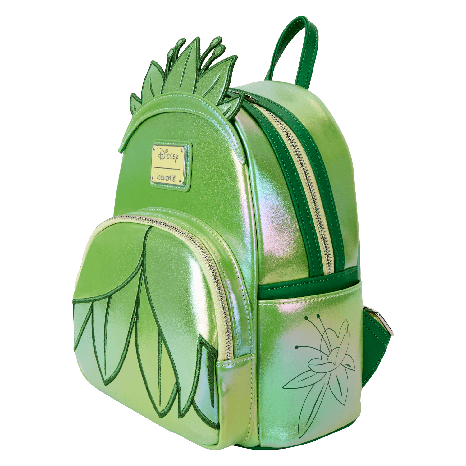 Let your dreams shine brighter than the evening star! This mini backpack celebrates Princess Tiana’s story by recreating her lily-inspired ballgown. Iridescent and embroidered features highlight the details of her dress, giving the bag a sparkly glimmer. Add this accessory to your next outfit for some royal inspiration on your next adventure!