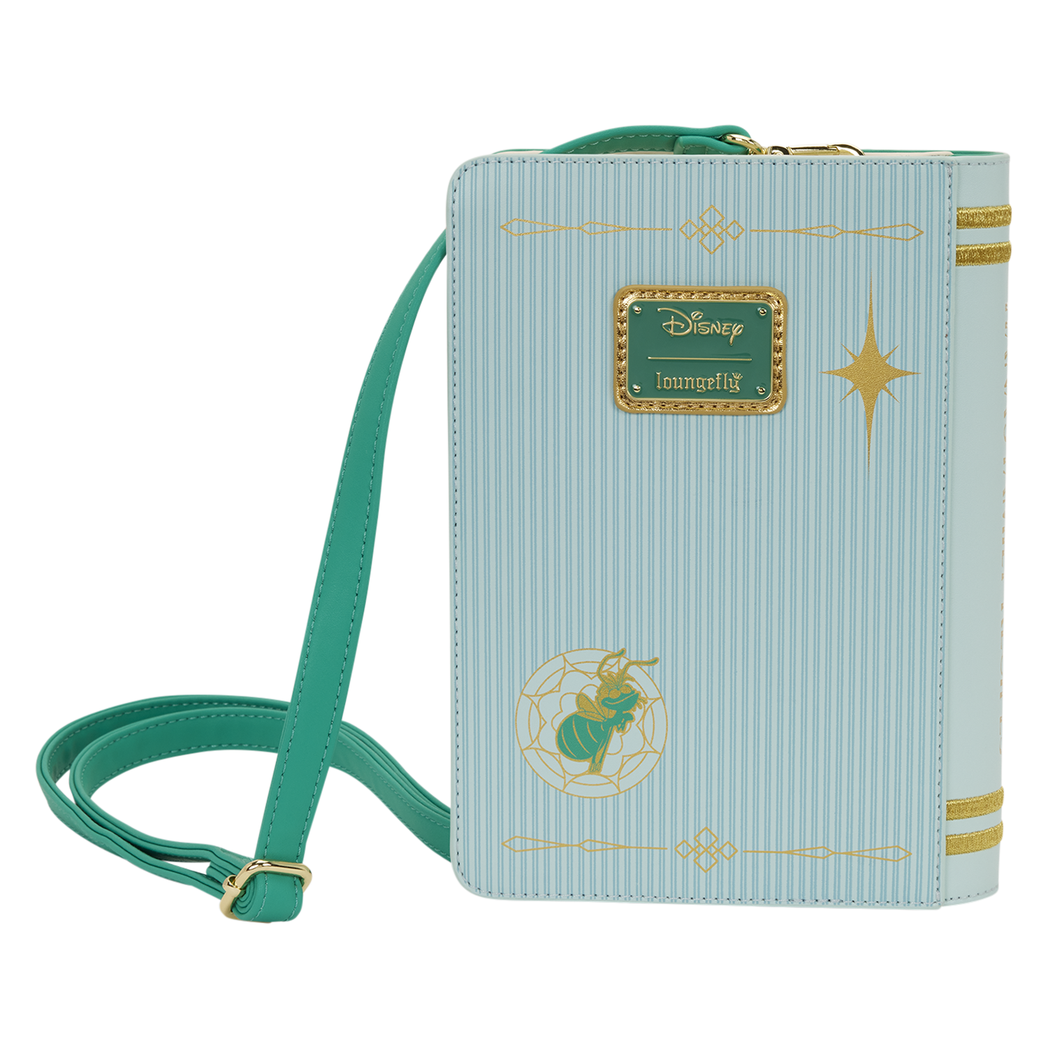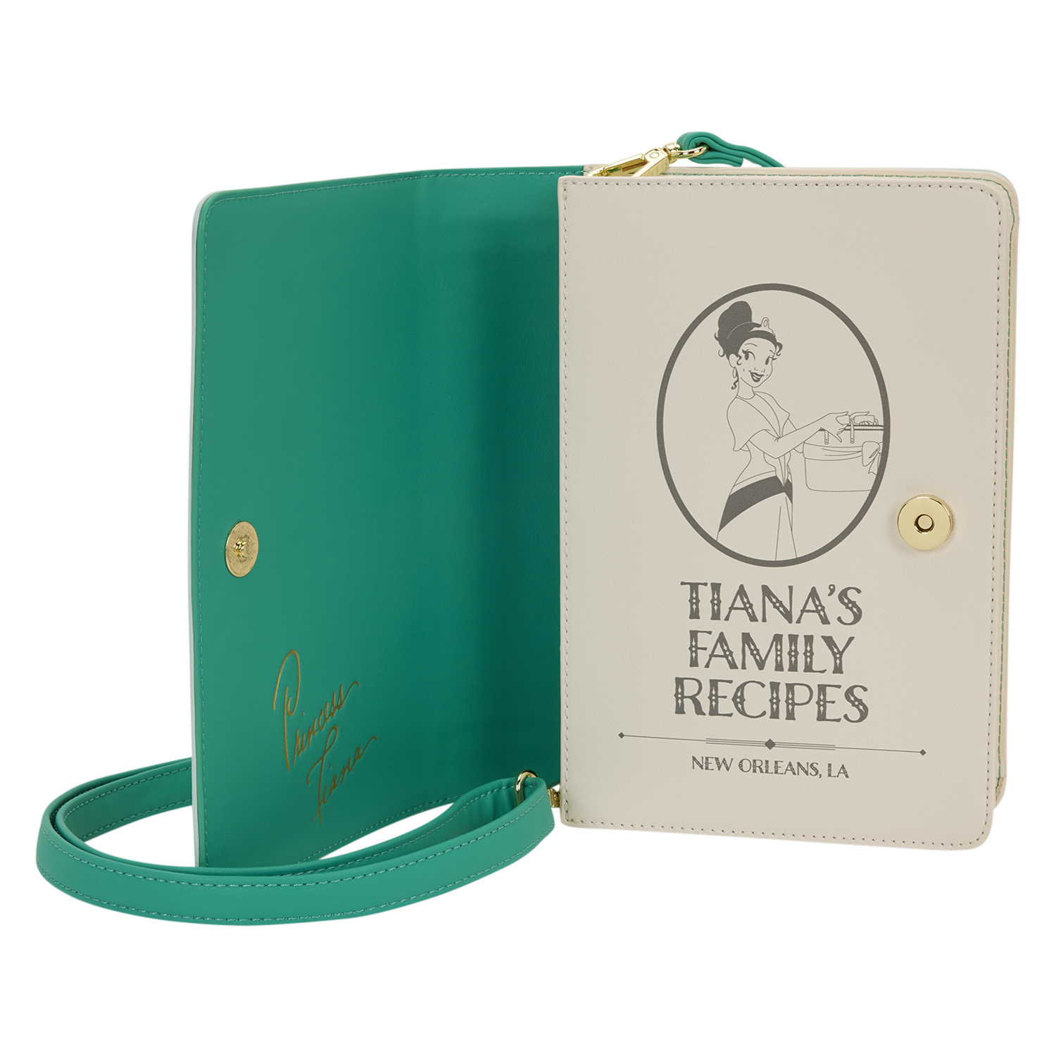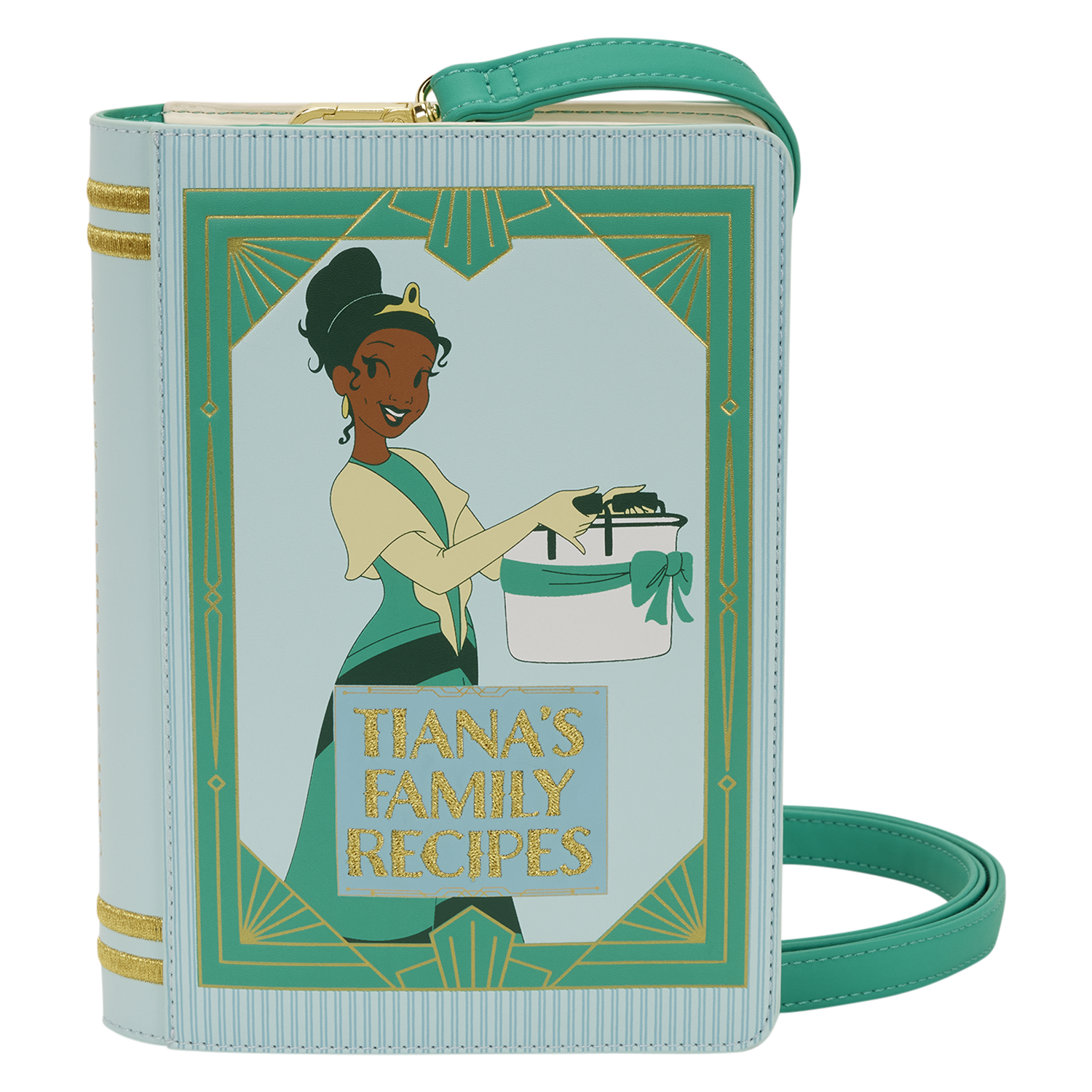 This crossbody bag is in the shape of Tiana's recipe book! You'll find an image of her on the cover with the title, "Tiana's Family Recipes" written in golden embroidery. Turn the bag around to find an image of Ray and gold foil designs! You can even open the front cover to find the title page with debossed details of Tiana and the title written out again!