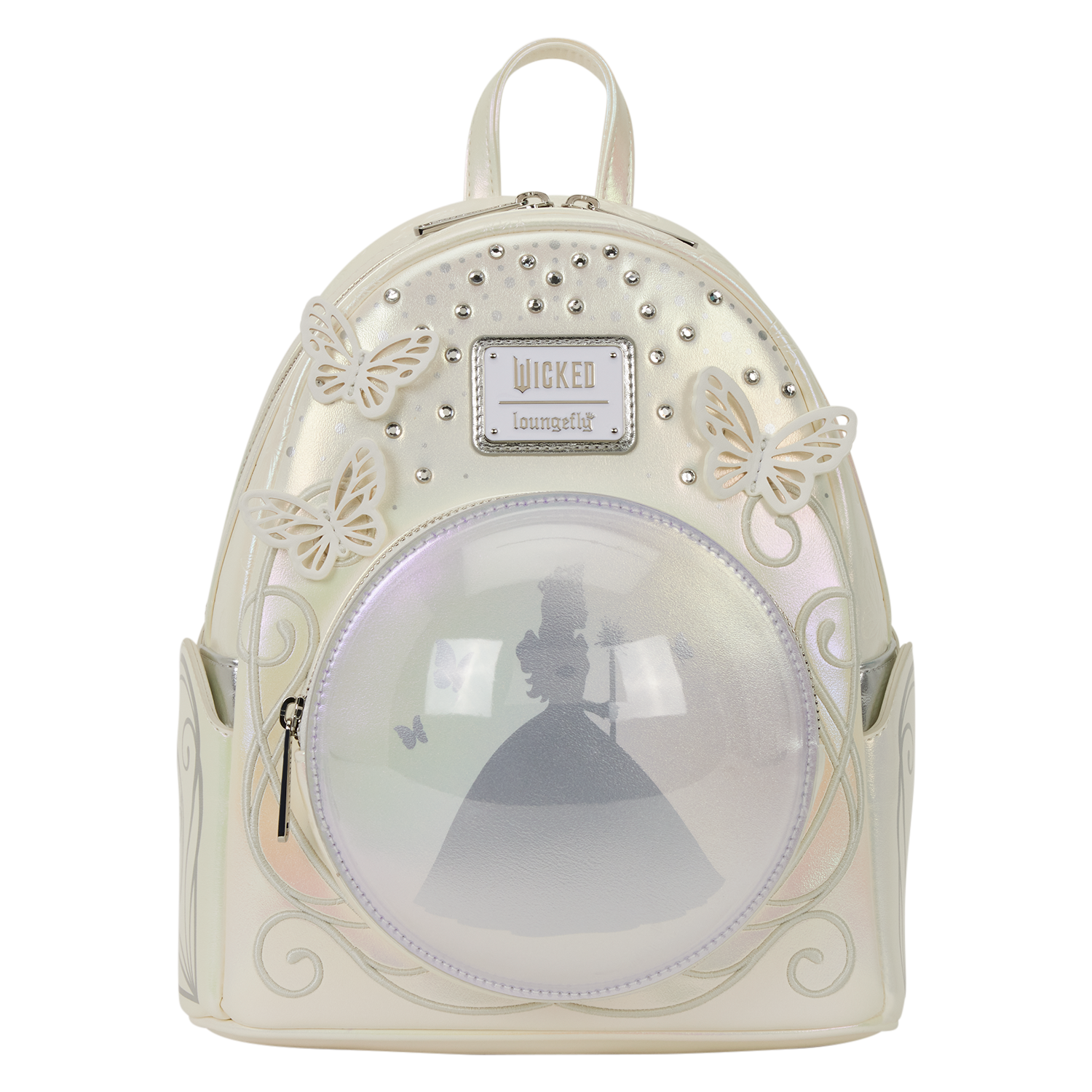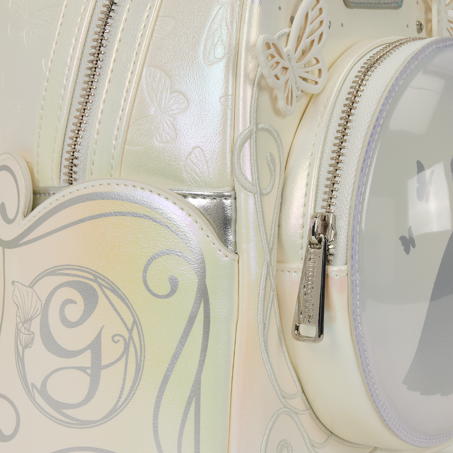 This gorgeous mini backpack features pearlescent faux leather with elegant details, including silver foil, rhinestones, and raised tonal embroidery. Over the front pocket, you'll find a clear PVC bubble with Glinda inside it! Butterflies and swirling silver designs cover the bag. The straps feature a debossed pattern of butterflies.