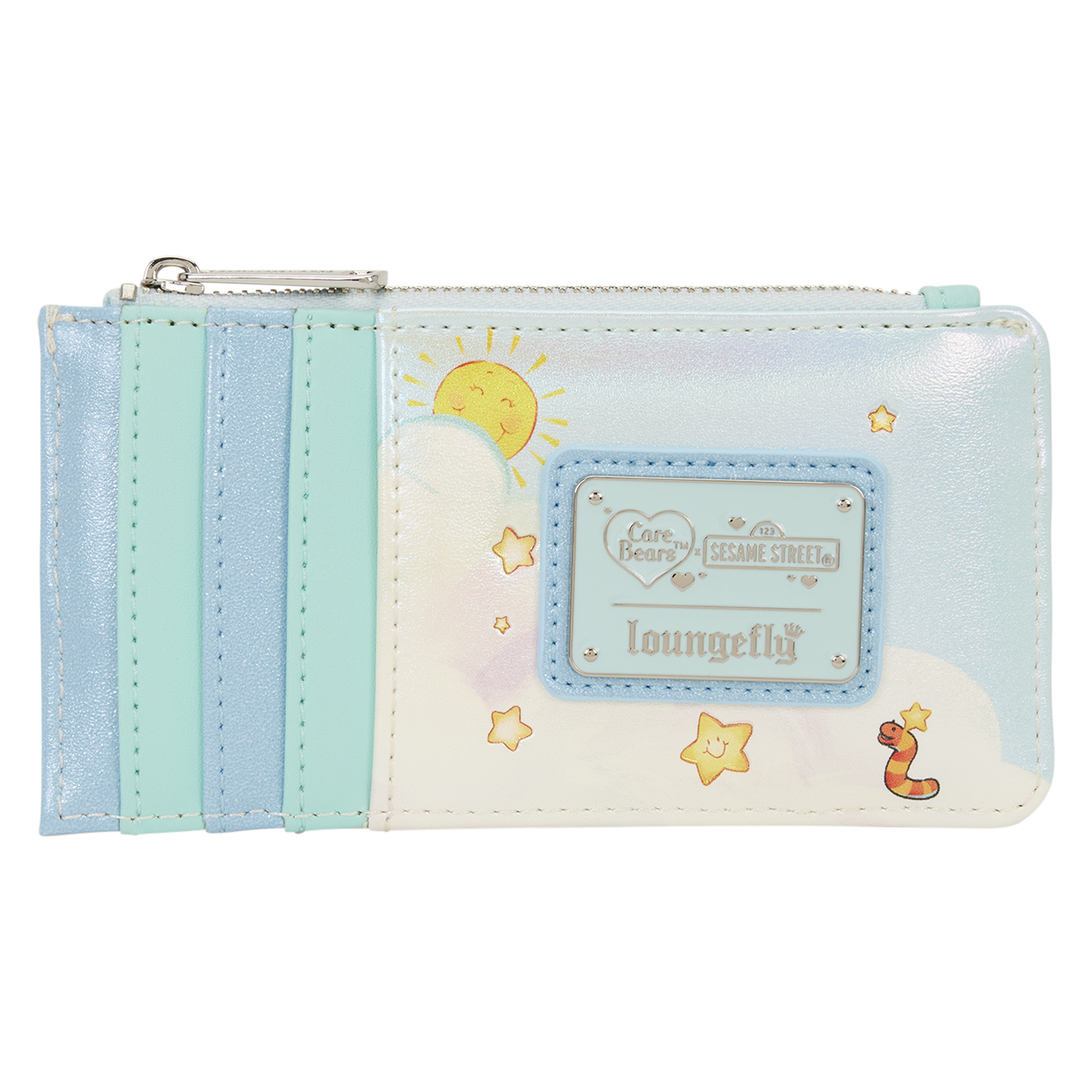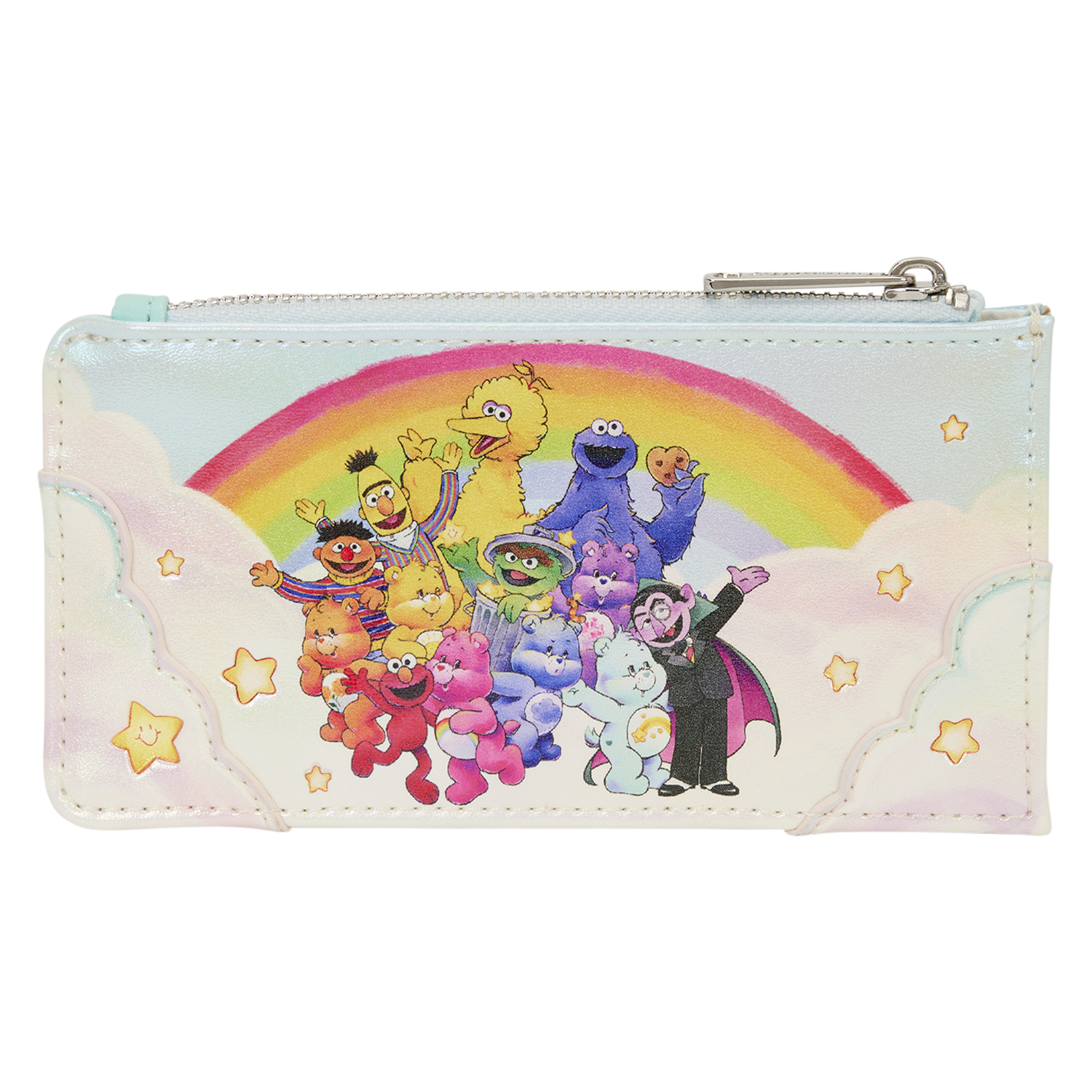 You'll find some of your favorite Sesame Street characters hanging out with your fav Care Bears characters on a bed of clouds with a rainbow in the background! You'll find debossed, iridescent, and glitter details to really make it shine. Turn the card holder around to find four card slots to hold essentials.