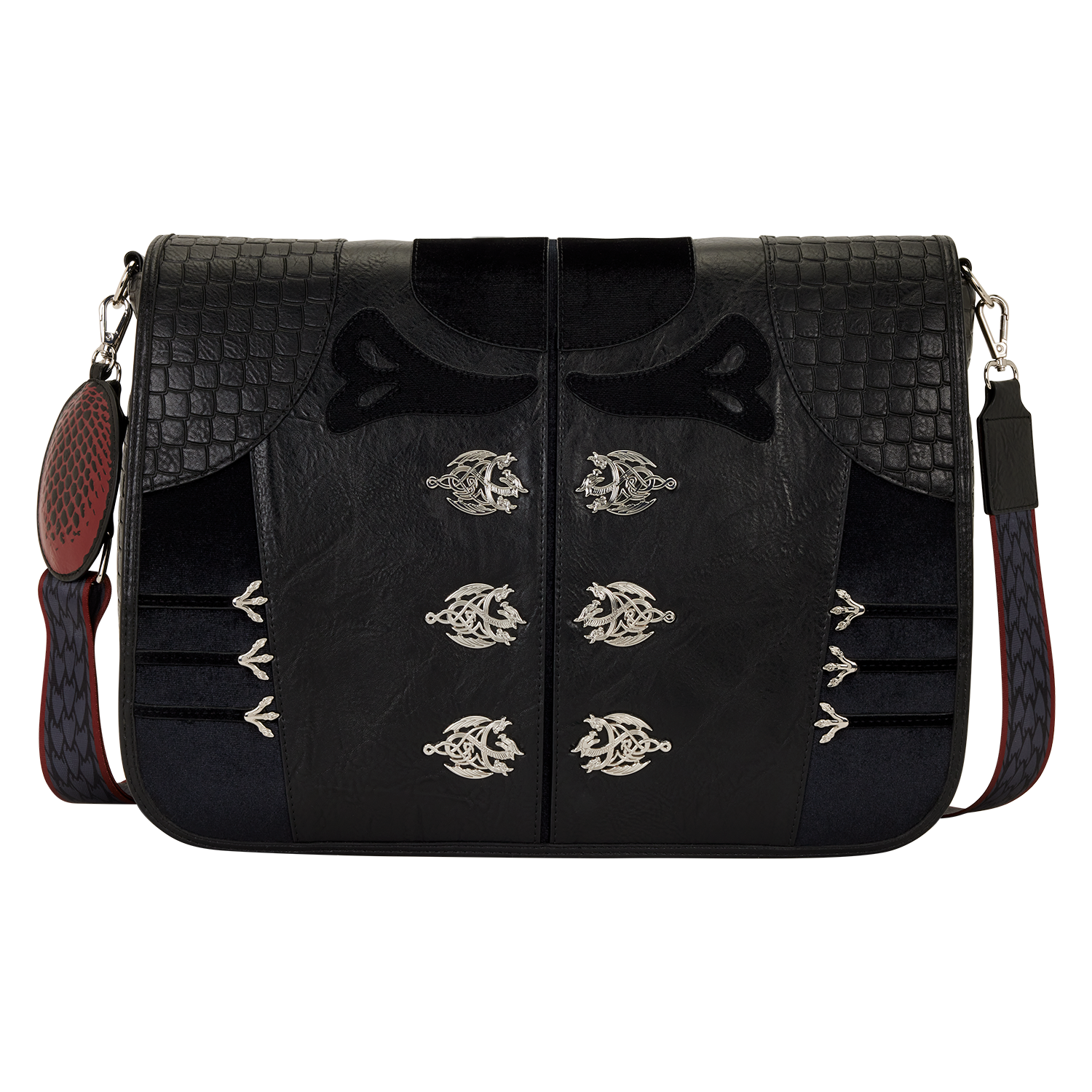 This bag is perfect to hold all your essentials as you plot your day. You'll find familiar details on the bag, like metal dragon charms similar to what Rhaenyra Targaryen wears in the show. Attached to the bag is a charm in the shape of a dragon egg. Embossed, distressed, and velvet details bring it all together.