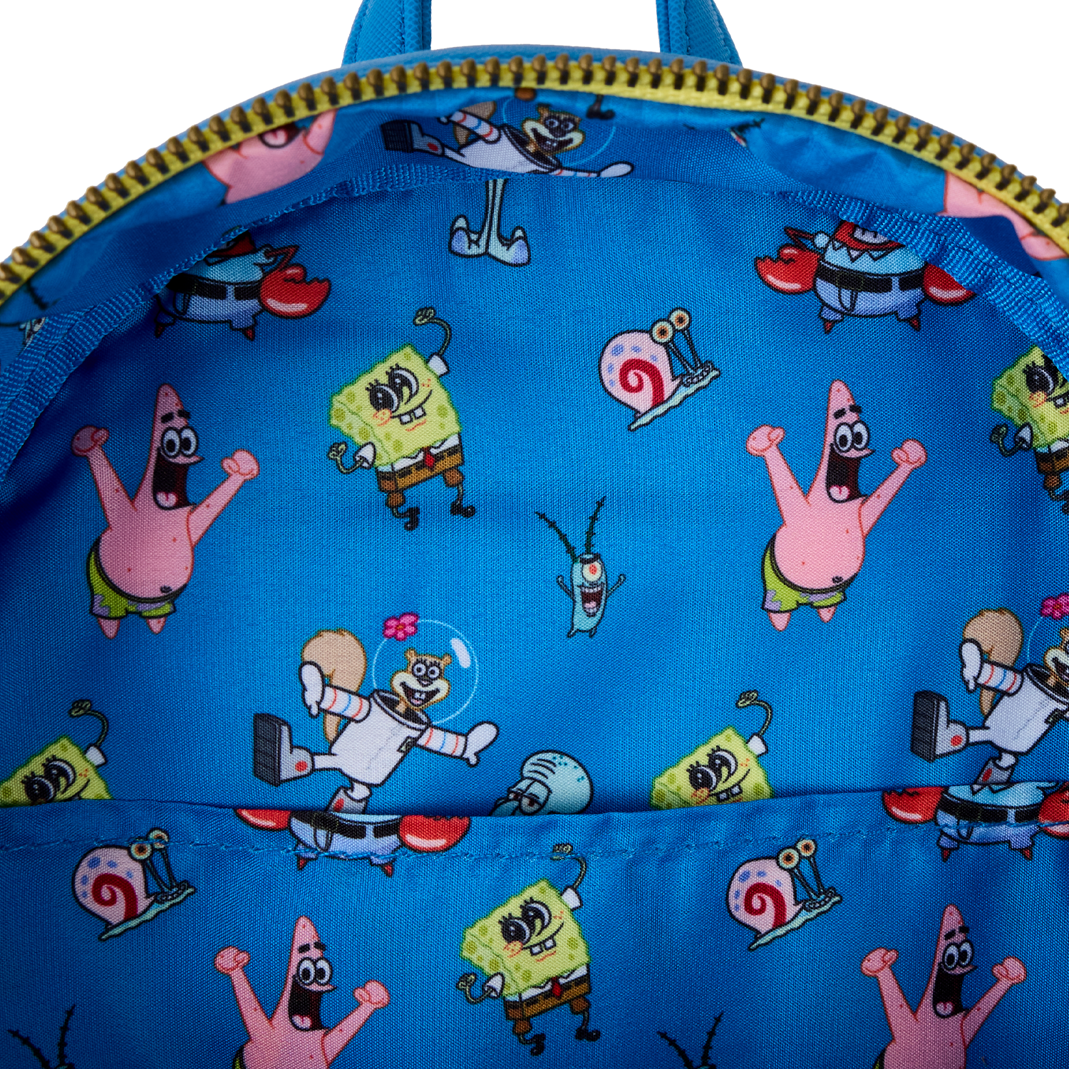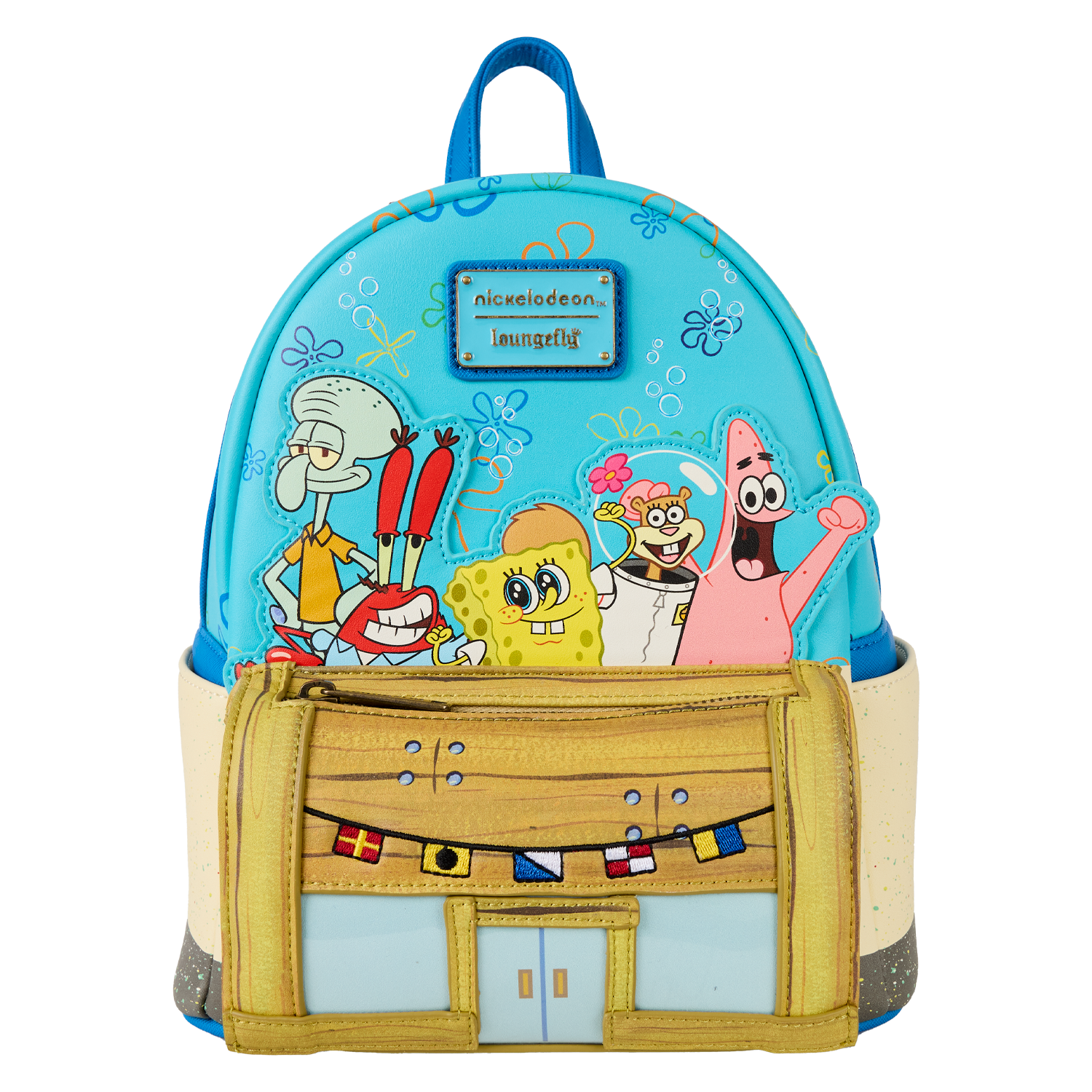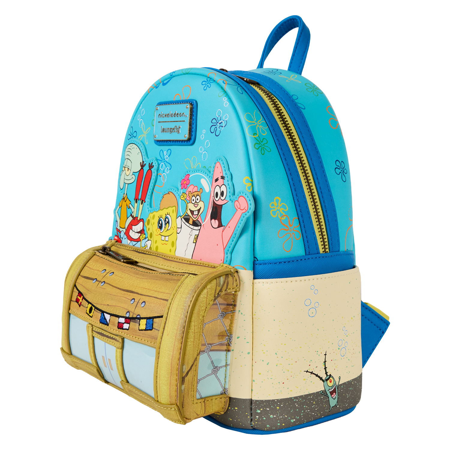 Jumpin’ jellyfish! Your taste in fashion is a sight to sea. Show off your fandom with our SpongeBob and Friends Krusty Krab Mini Backpack. The front pocket resembles the Krusty Krab building, with clear PVC windows, revealing a fishnet print. Embroidered flags “hang” above. You might also spy an applique of SpongeBob, Squidward, Mr. Krabs, Patrick, and Sandy Cheeks above the front pocket. Behind them, the signature SpongeBob SquarePants underwater ocean-themed motif appears. The side pockets feature prints of Plankton and Gary, and on the back, the Chum Bucket appears. Gather your Krusty Krew and take off on fun adventures in style.