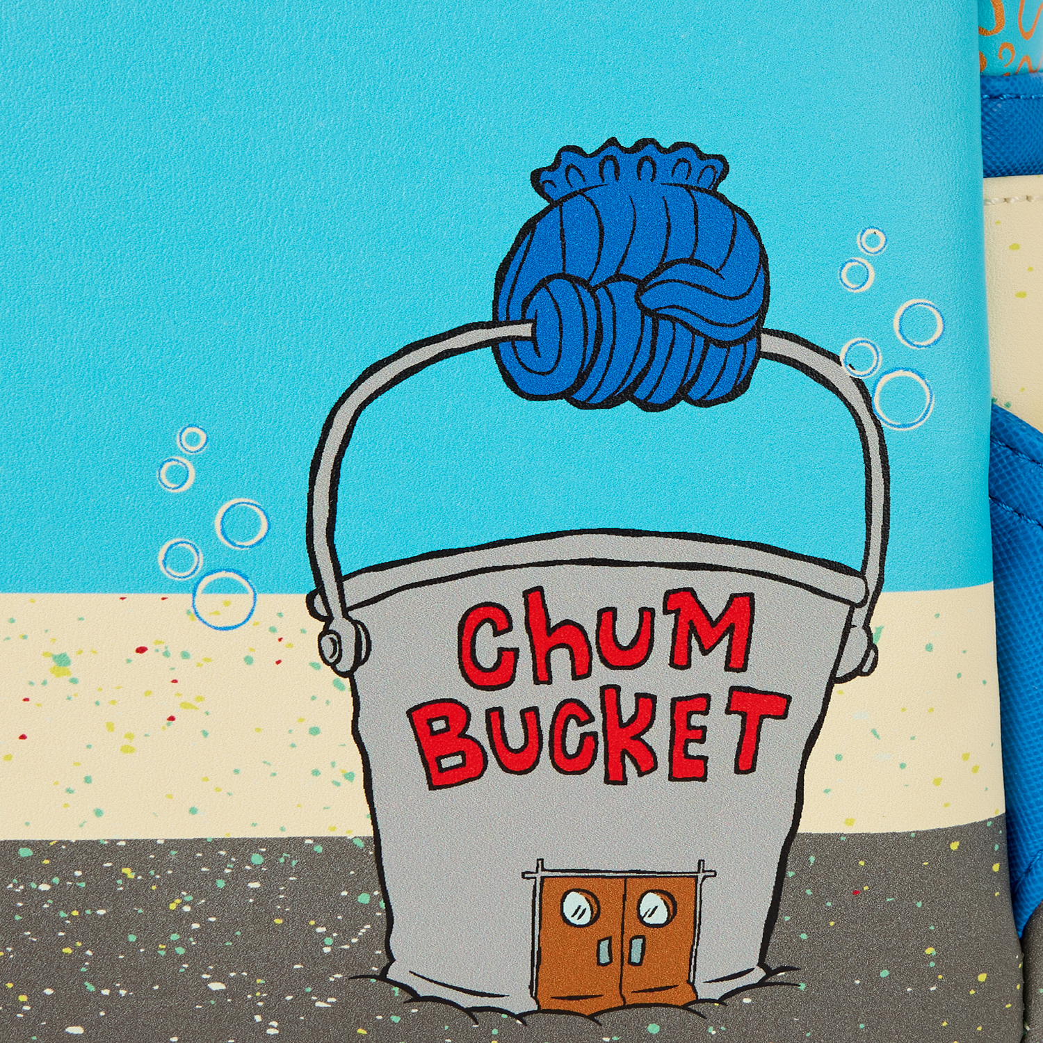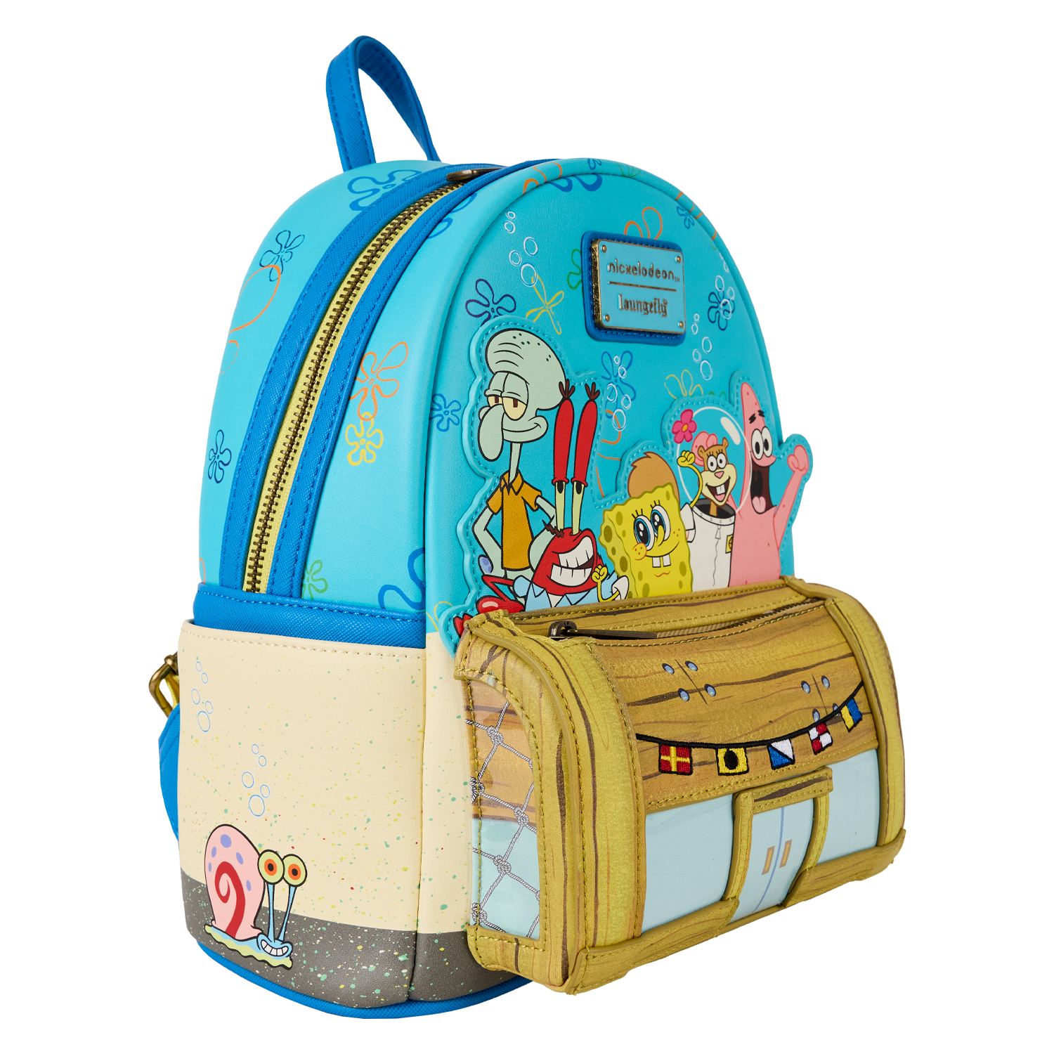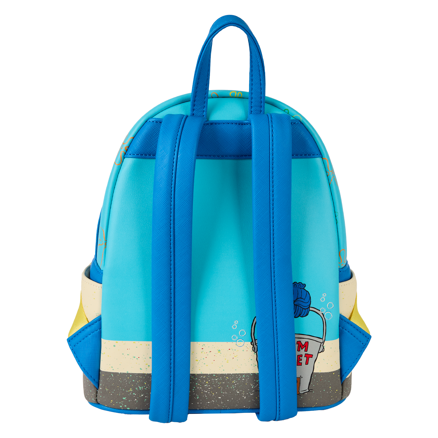 Jumpin’ jellyfish! Your taste in fashion is a sight to sea. Show off your fandom with our SpongeBob and Friends Krusty Krab Mini Backpack. The front pocket resembles the Krusty Krab building, with clear PVC windows, revealing a fishnet print. Embroidered flags “hang” above. You might also spy an applique of SpongeBob, Squidward, Mr. Krabs, Patrick, and Sandy Cheeks above the front pocket. Behind them, the signature SpongeBob SquarePants underwater ocean-themed motif appears. The side pockets feature prints of Plankton and Gary, and on the back, the Chum Bucket appears. Gather your Krusty Krew and take off on fun adventures in style.