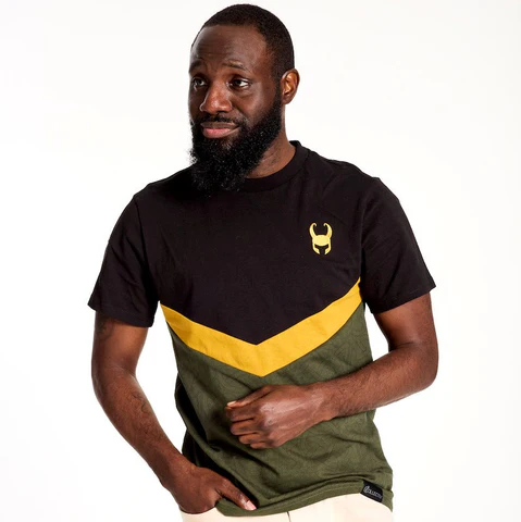 For when you want just a wink to your favourite fandom, The ORIGINL tee is meant for you. Show off your love for Loki with simple, subtle style. You’ll find Loki’s helmet embroidered on the upper right corner. The top of the shirt is black, and the bottom is green with a subtle pattern of Loki’s snake symbol. A gold chevron divides the two halves to complete the look. Low-key 😉fandom fashion is at your fingertips with this shirt.
