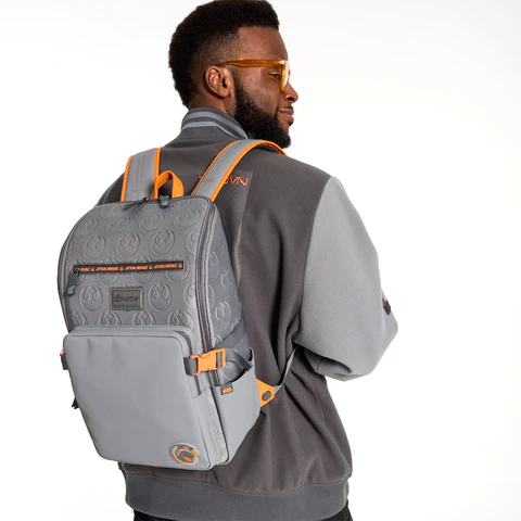 Are you a true MULTI-TASKR? Everything you need is right here. This bag = mixed functionality whenever, wherever. It has nods to Star Wars with a debossed pattern of the Rebel Alliance symbol over the front and a silicone patch of the Rebel X-Wing Pilot symbol. You’ll also find Rebel Alliance X-Wing motifs along the straps.