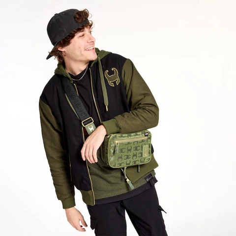 If versatility and portability is what you’re looking for while you’re out and about, this is what you need. You can easily switch this bag from a sling to a crossbody with the adjustable strap. Sleek and effortless fandom style is included – you’ll find a debossed print of Loki’s helmet all over the bag against a green background.