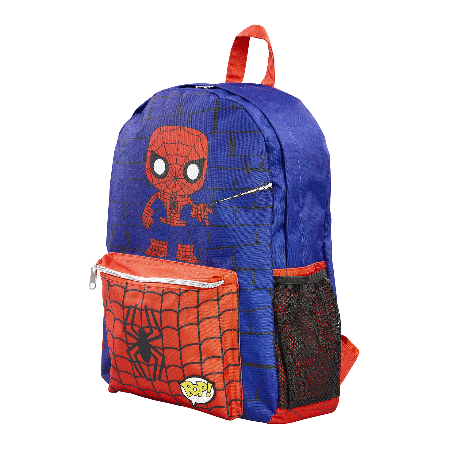 A fashionable web design that packs a punch? Our Marvel Spider-Man backpack is ready for any challenge. This backpack, in signature Spider-Man colours, features the spider symbol on the front pocket, along with an applique quote bubble that says “POP!” A print of POP! Spider-Man appears above, and a web pattern on the straps adds an authentic touch. Leap into action and turn everyday outings into superheroe adventures.