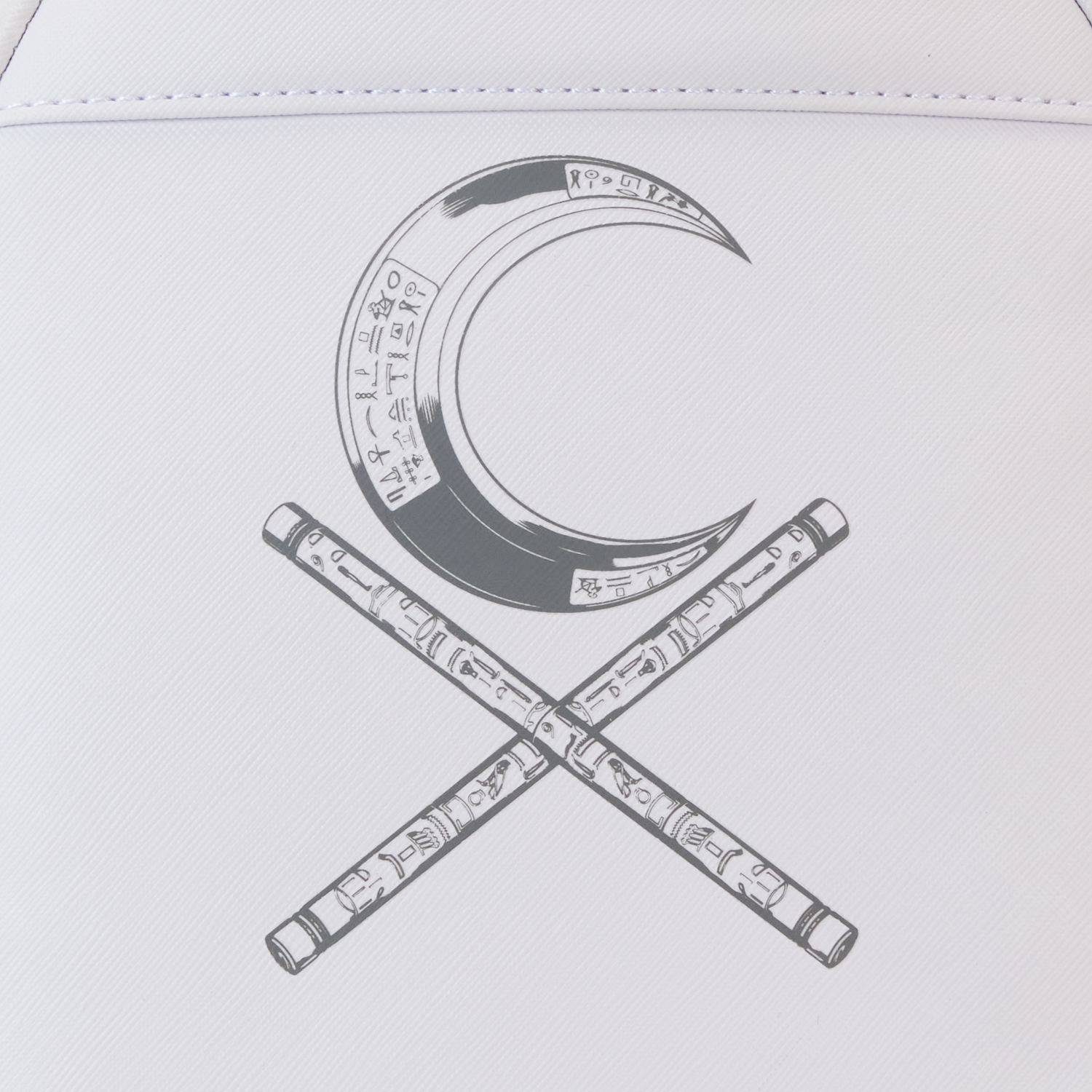 Summon the suit! Steven Grant takes the role of Khonshu’s avatar on the C2E2 2024 Exclusive Loungefly Moon Knight Mr. Knight Mini Backpack. On the front, Mr. Knight’s mask takes shape with embossed stitching and a crescent moon emblem. LED lights give his eyes a menacing glow beneath the mask, and suit details continue onto the zipper pocket below. Look closely to see the intricate patterns of his jacket and necktie while a baton-shaped zipper charm completes the look. A chevron pattern covers the bag’s side pockets, accompanying a Moon Knight symbol on either side. On the back, Moon Knight’s crescent dart appears above Mr. Knight’s batons as the chevron pattern continues onto the bag’s shoulder straps. This mini backpack has plenty of room to hold your gear and will keep you looking top-notch on your next mission. Act fast to collect this 1,800-piece limited edition Loungefly exclusive.