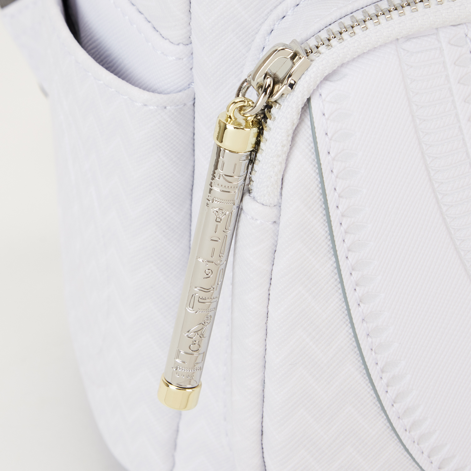 The C2E2 2024 Exclusive Loungefly Moon Knight Mr. Knight Mini Backpack is made of vegan Saffiano leather (polyurethane). Bag has adjustable shoulder straps and shiny silver hardware. Additional features include applique, embossed, debossed, light-up, and printed details. Take note of the coordinating inside lining.
