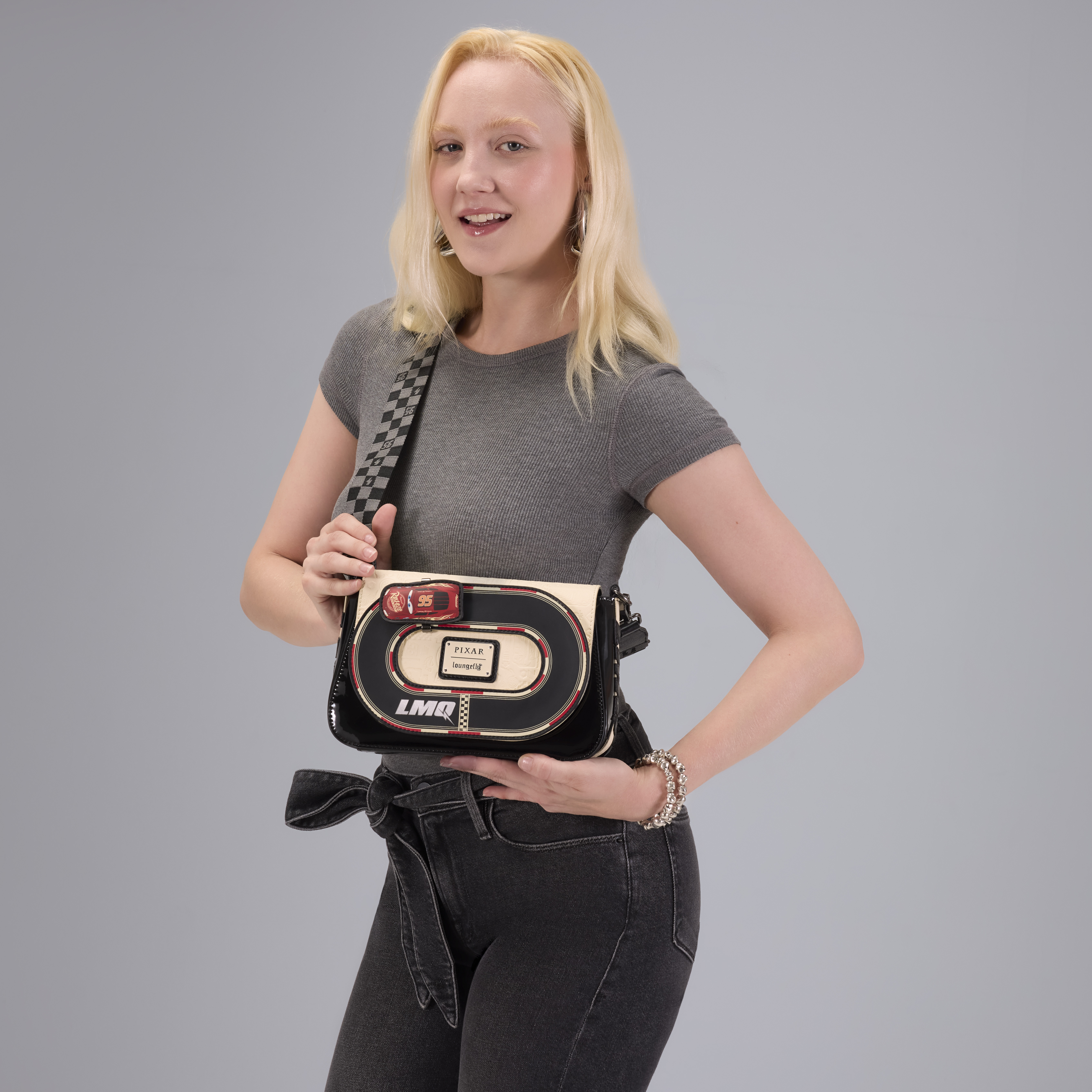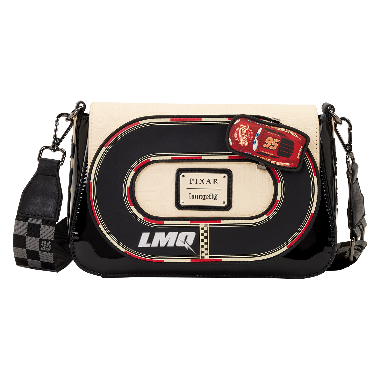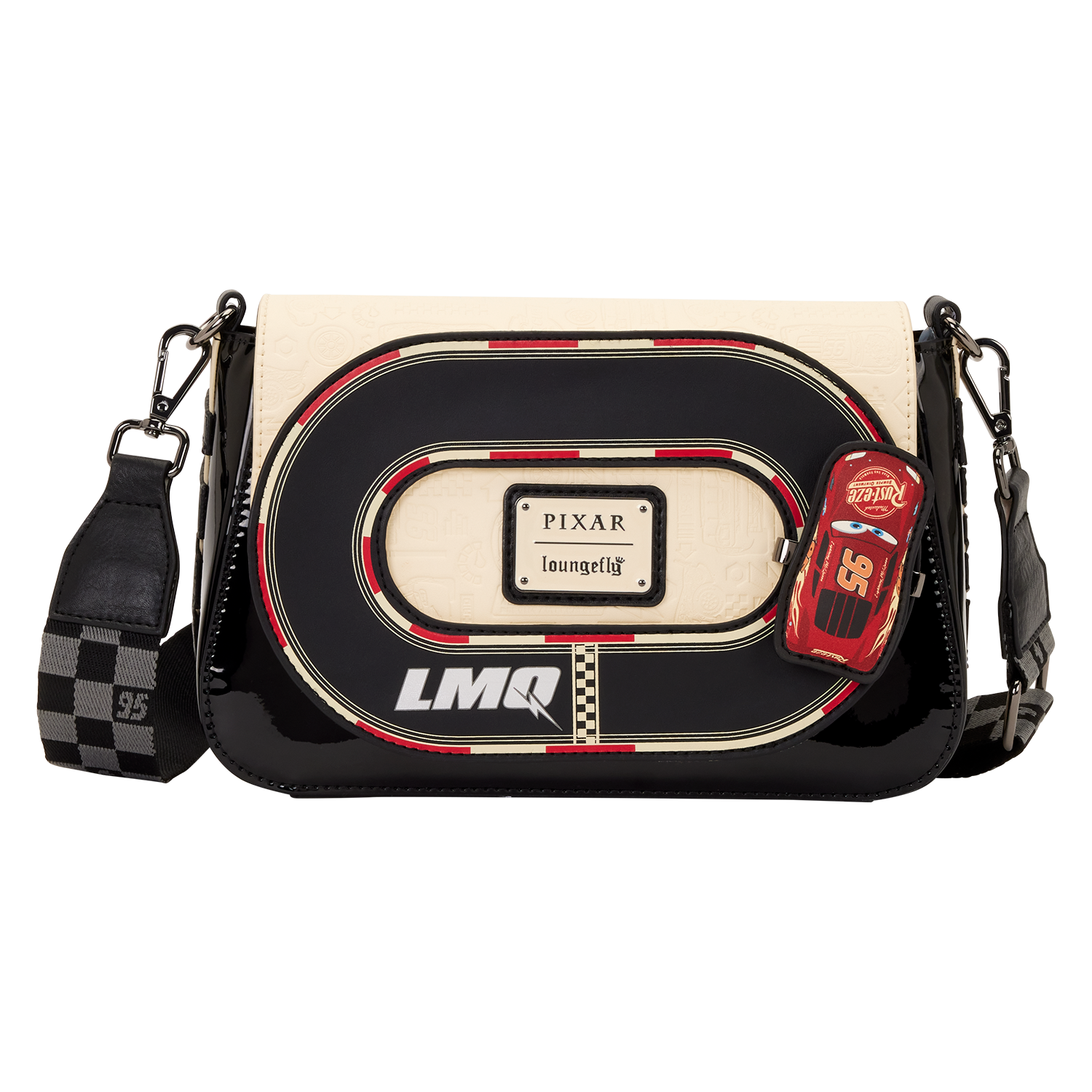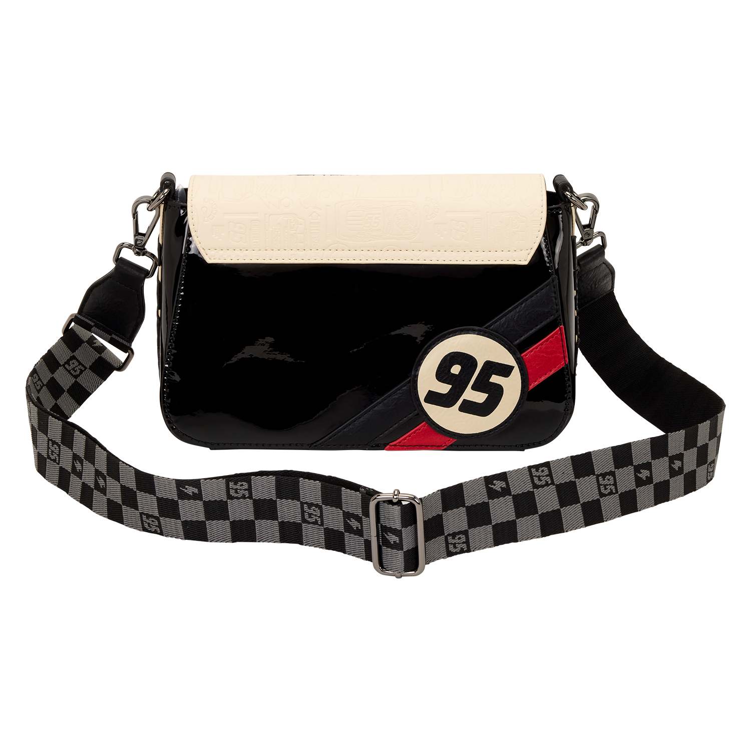 This crossbody features a racetrack on the front flap. An applique of Lightning McQueen actually moves around the track! Pretty epic, right?! The body of the bag is made of glossy patent faux leather for an elevated feel. You'll find "95" written on the back of the bag and a checkered pattern on the crossbody strap.