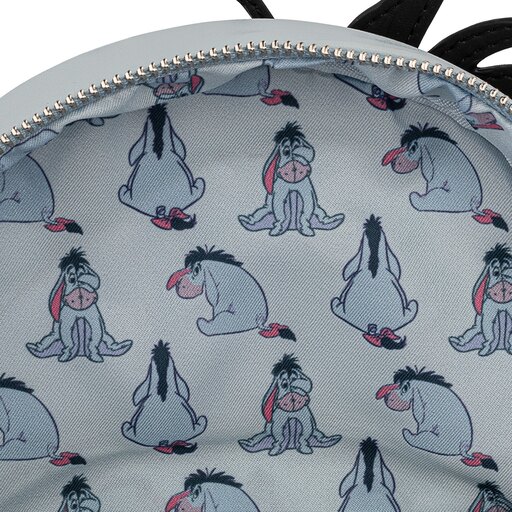 The Disney Winnie the Pooh Eeyore Cosplay Mini Backpack is made of vegan leather (polyurethane). Bag has adjustable shoulder straps, sturdy metal hardware, and features: applique, metal rivet, debossed, and printed details. Take note of the coordinating pattern of the inside lining fabric.