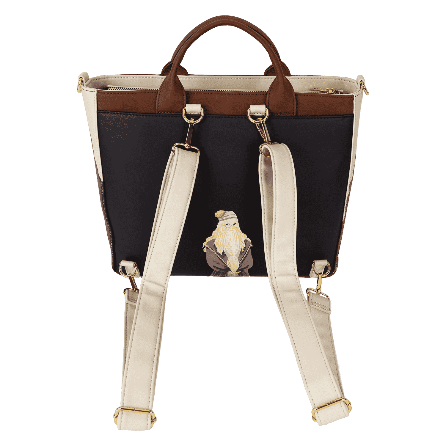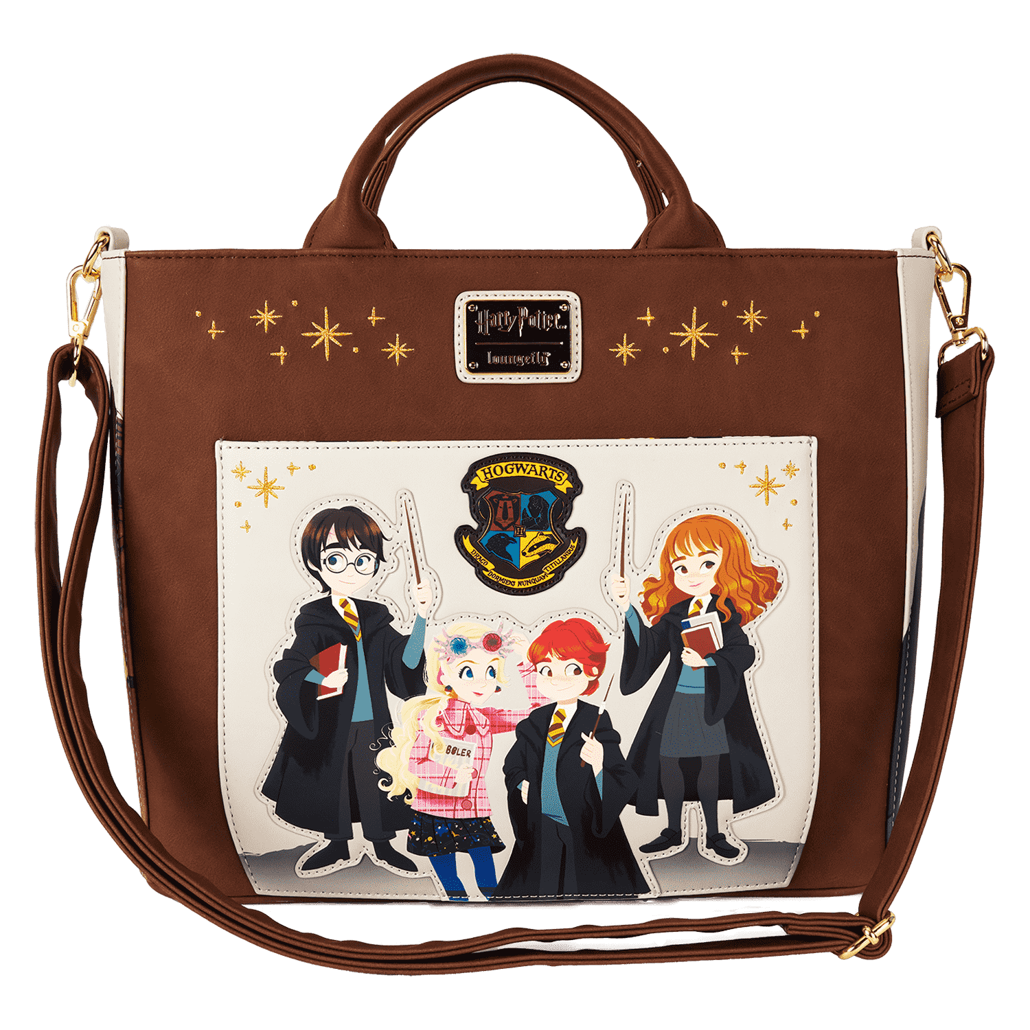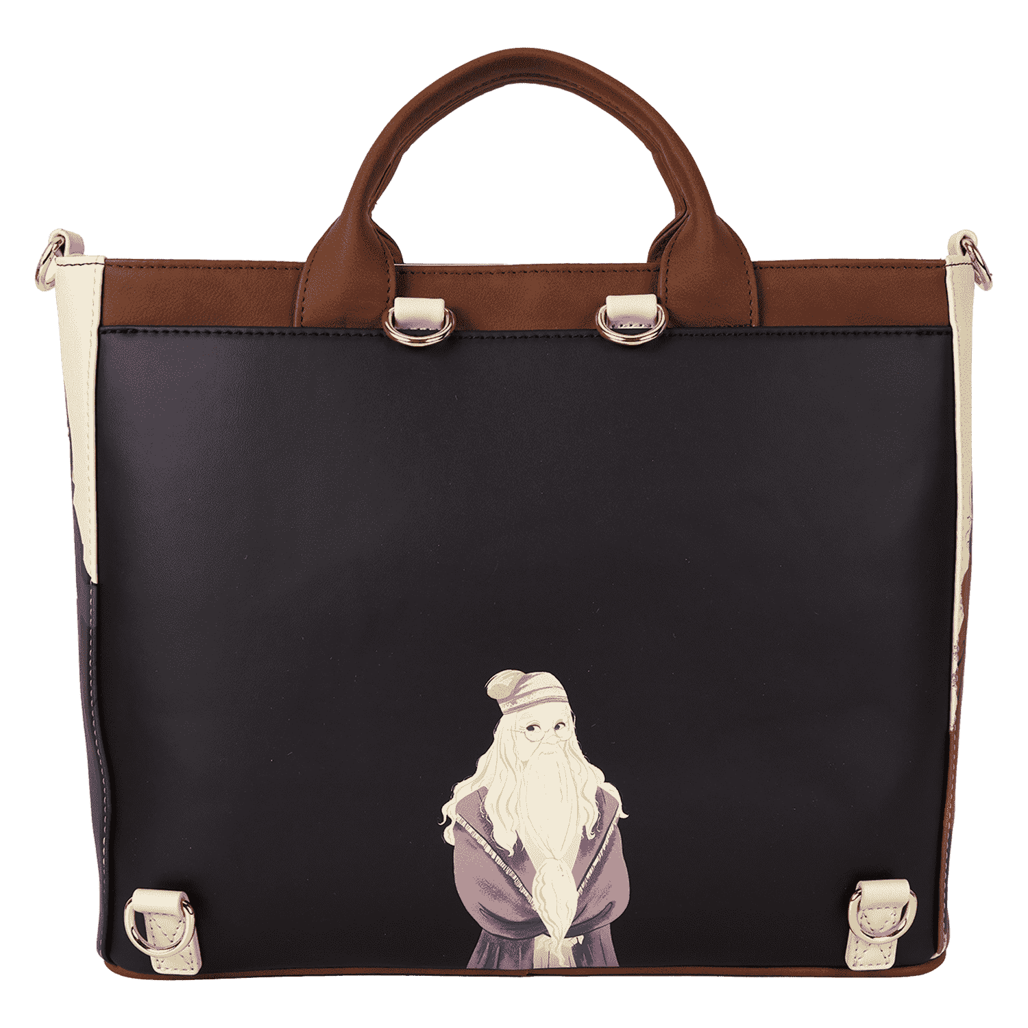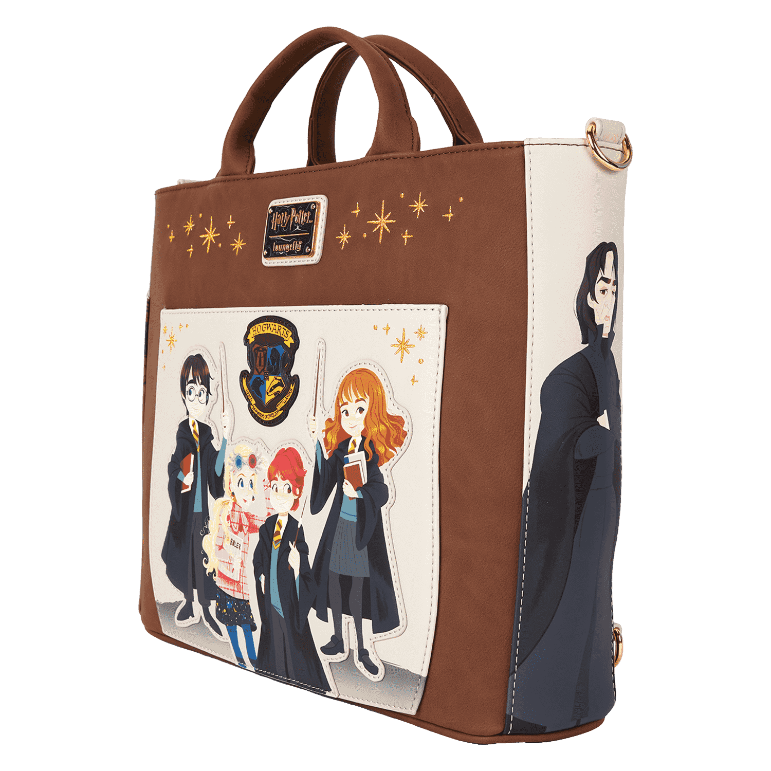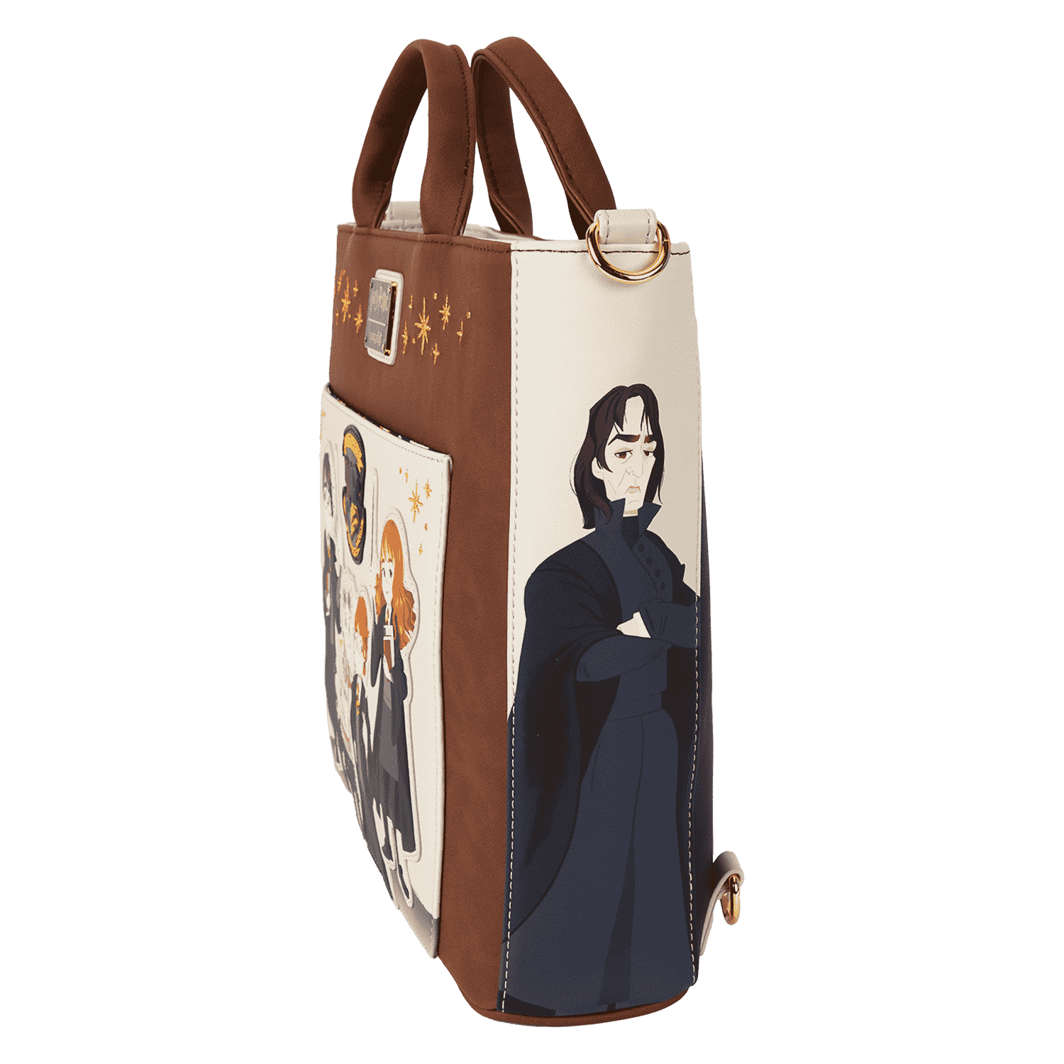 Arrive with class on the first day at Hogwarts™, Harry Potter™ fans! Enchant the halls with this Harry Potter convertible tote bag, which features an applique of the Hogwarts crest and classmates Luna Lovegood, Harry Potter, Ron Weasley, and Hermione Granger—all wands at the ready. Embroidered gold “sparkles,” indicate an allusion to magic. Flip the bag around, and Professor Albus Dumbledore appears as a print. Even the side pockets include beautiful images of Harry Potter characters, including Severus Snape and Rubeus Hagrid. Adjustable and detachable straps allow you to switch up your style, converting the tote to a backpack when adventure calls. There’s just enough room for packing your daily essentials and setting off on magical journeys in style.