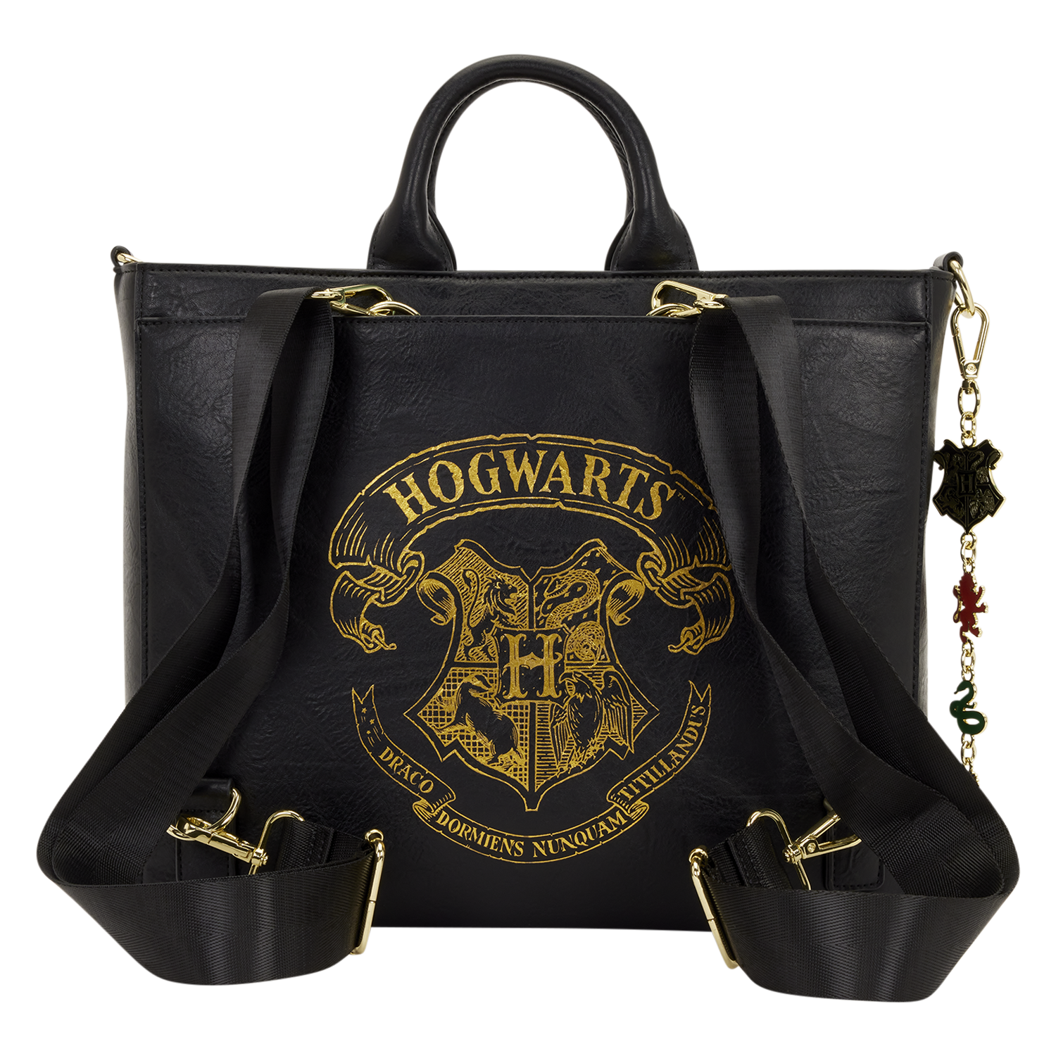 This Harry Potter bag is a must for any fan that wants to add some fandom flair to their day! This tote can convert to a backpack so you can wear it however you'd like. The front pocket is in the shape of a Hogwarts letter, with debossed and PVC applique wax seal. Turn the bag around to find the Hogwarts emblem on the bag in gold foil. Attached to the bag is a keychain that features a charm of the Hogwarts logo and a charm of each Hogwarts house!