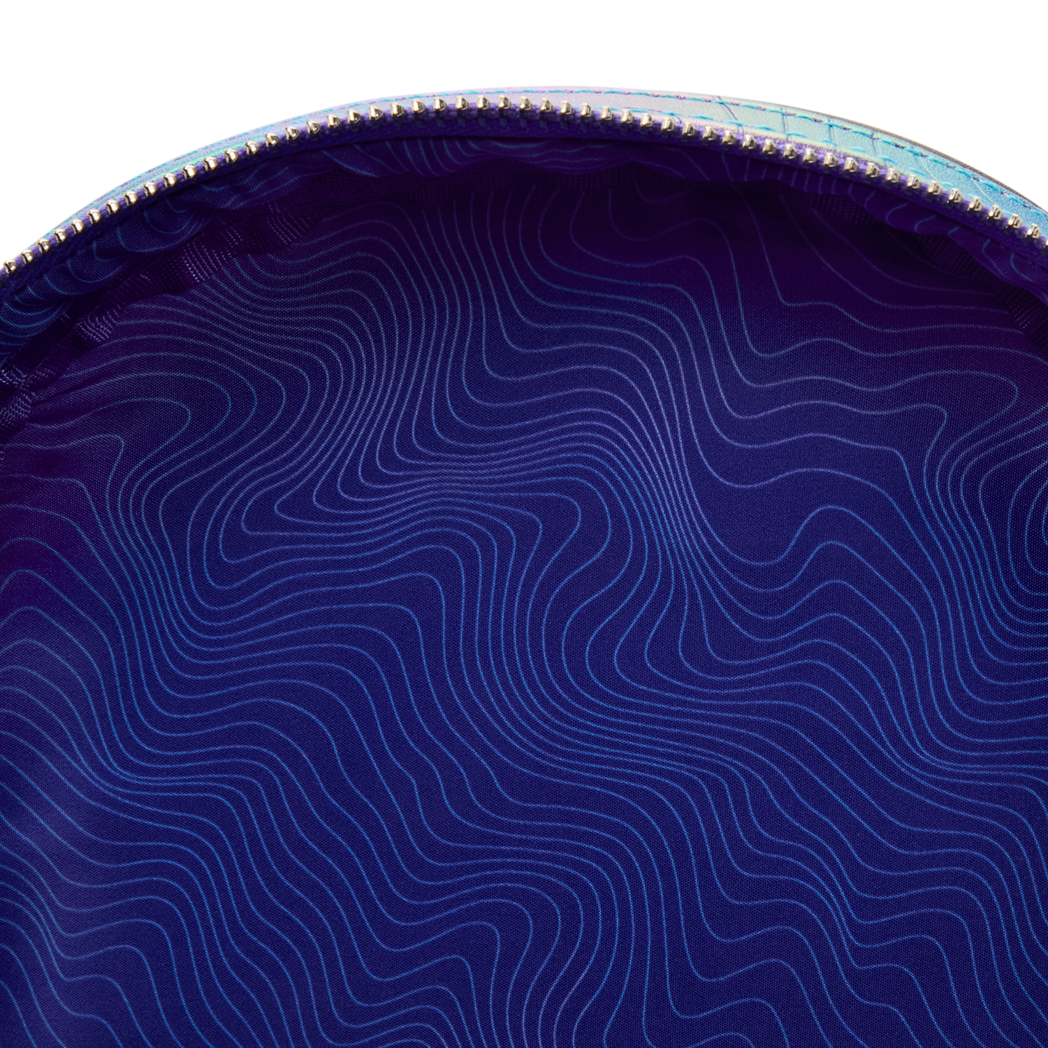 On this bag, you'll find iridescent appliques of Rumi, Mira, and Zoey. Purple highlights the side pockets, zipper, and straps. Star appliques are also on the straps. Attached to the bag is a photo card bag charm with three cards, one for Rumi, one for Mira, and one for Zoey. There's also a beaded charm attached with charms of a heart, bell, and turtle.