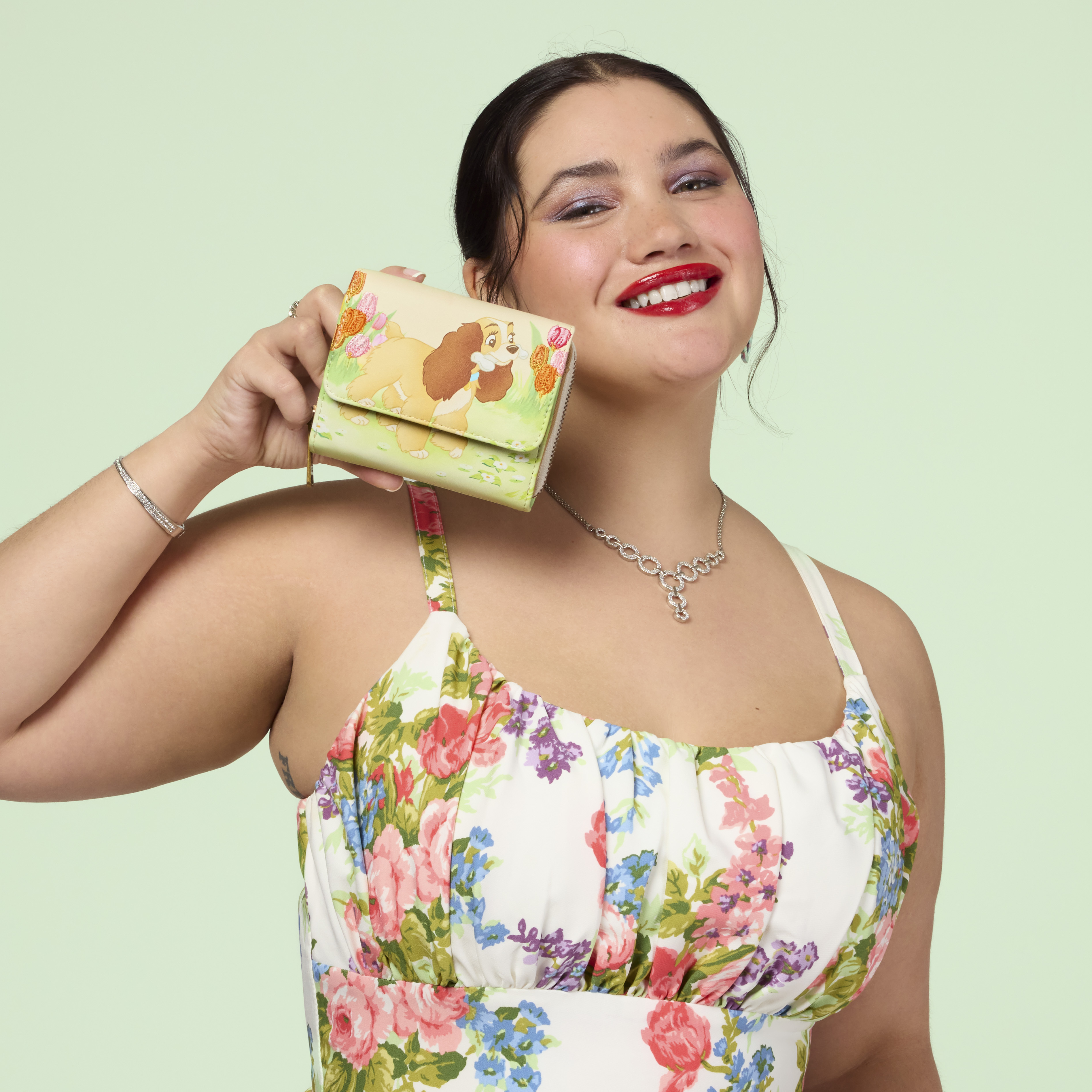 This wallet features Lady from Disney's Lady and the Tramp. She has a bone in her mouth and walks through a field of tulips. You'll find more tulips on the back! Inside, there are four card slots and one clear ID slot.