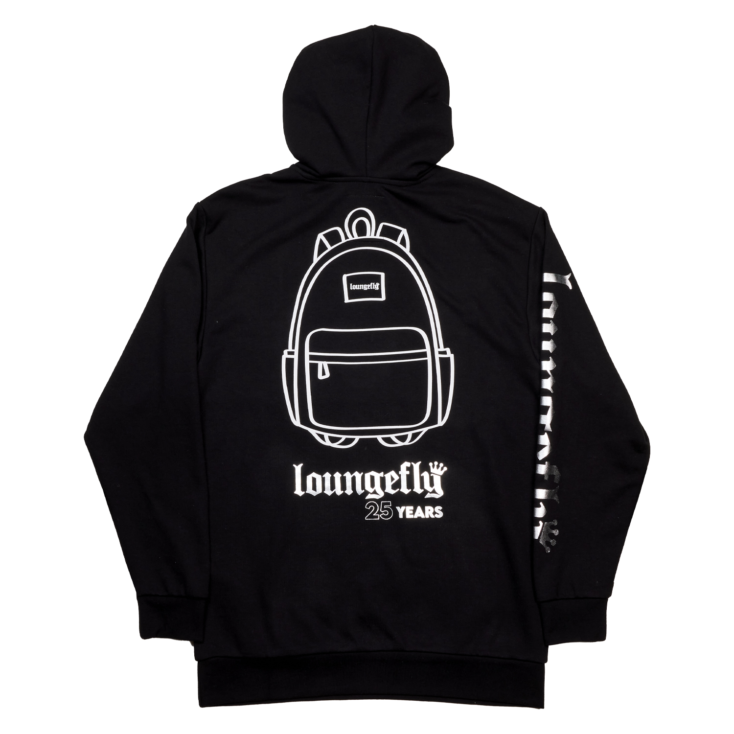 Say cheers to 25 years! Our Loungefly 25th Anniversary Unisex Hoodie is something to celebrate! On the front of this fashionable and comfy black hoodie, the abbreviated Loungefly crown emblem appears at the top in embroidered detail. Over the sleeve of one arm, you’ll find the full Loungefly crown logo in shiny silver foil print. On the back, a characteristic Loungefly mini backpack appears in a printed white outline, along with the words “Loungefly: 25 years” in silver foil print. When the weather turns chilly, slip your hands into the roomy front pocket to warm them up. Show off your love for all things Loungefly and take the celebration with you wherever you go.