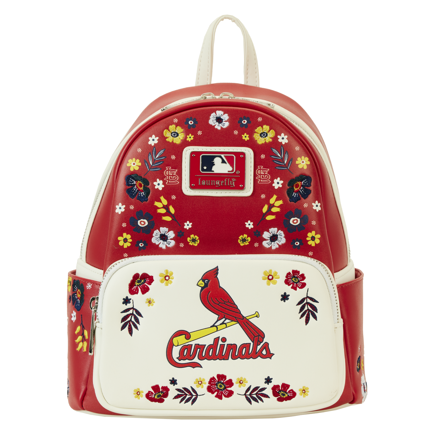 Let the love for your home team bloom! The Loungefly St. Louis Cardinals Floral Mini Backpack is an instant win for any baseball fan. This red backpack features an array of embroidered flowers that surround the team’s logo. The front zipper pocket shows an embossed version of the team’s name, and floral details continue onto the bag’s side pockets. Turn the bag around to see an encore appearance of the SL logo while red, blue, and yellow flowers appear on the shoulder straps. This stylish accessory gives a fresh take to your sporty looks and will keep your belongings safe at home and on the road.