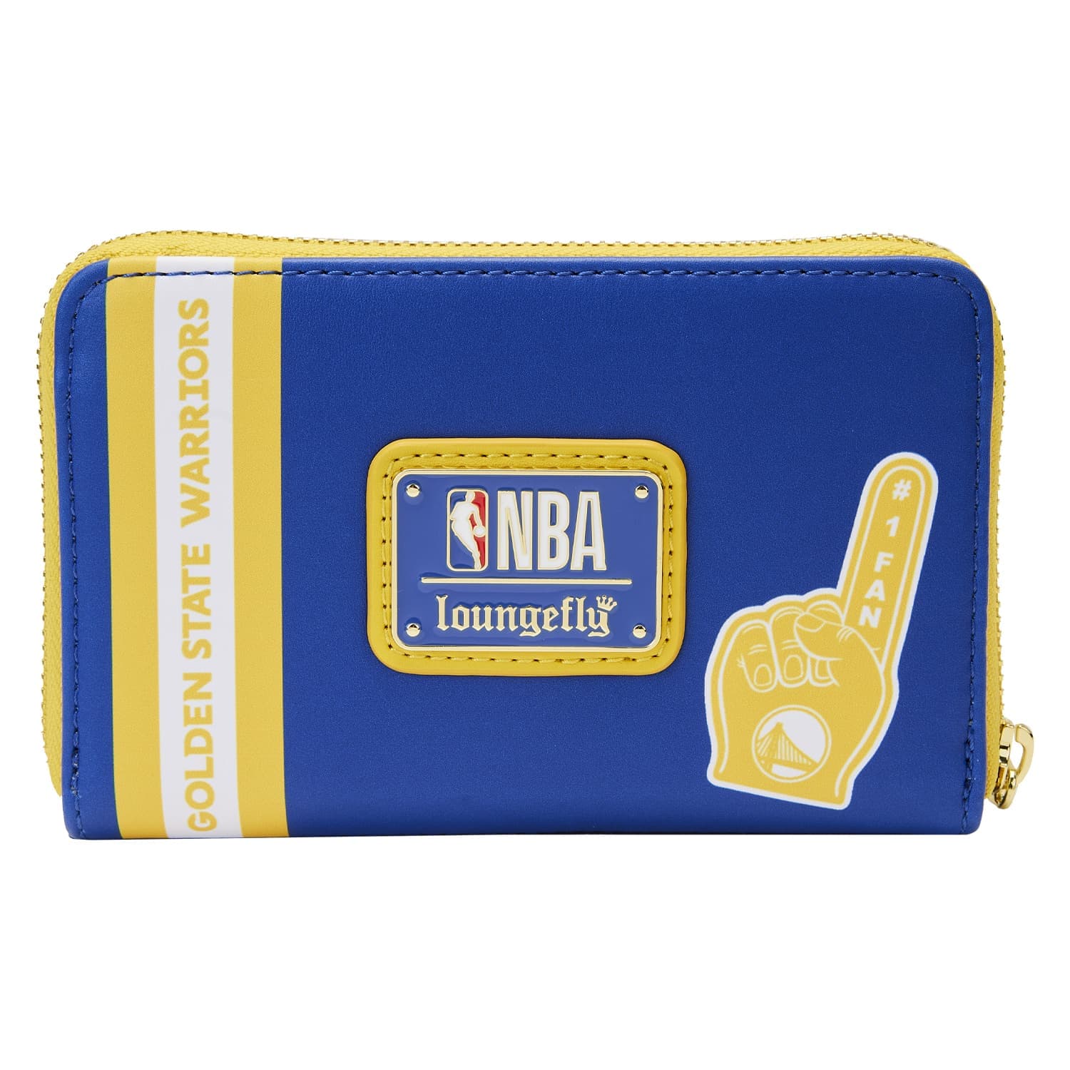 The Loungefly NBA Golden State Warriors Patch Icons Zip Around Wallet is made of vegan leather (polyurethane). Wallet zips closed with sturdy metal hardware. Additional features include applique and printed details. Take note of the coordinating inside lining.