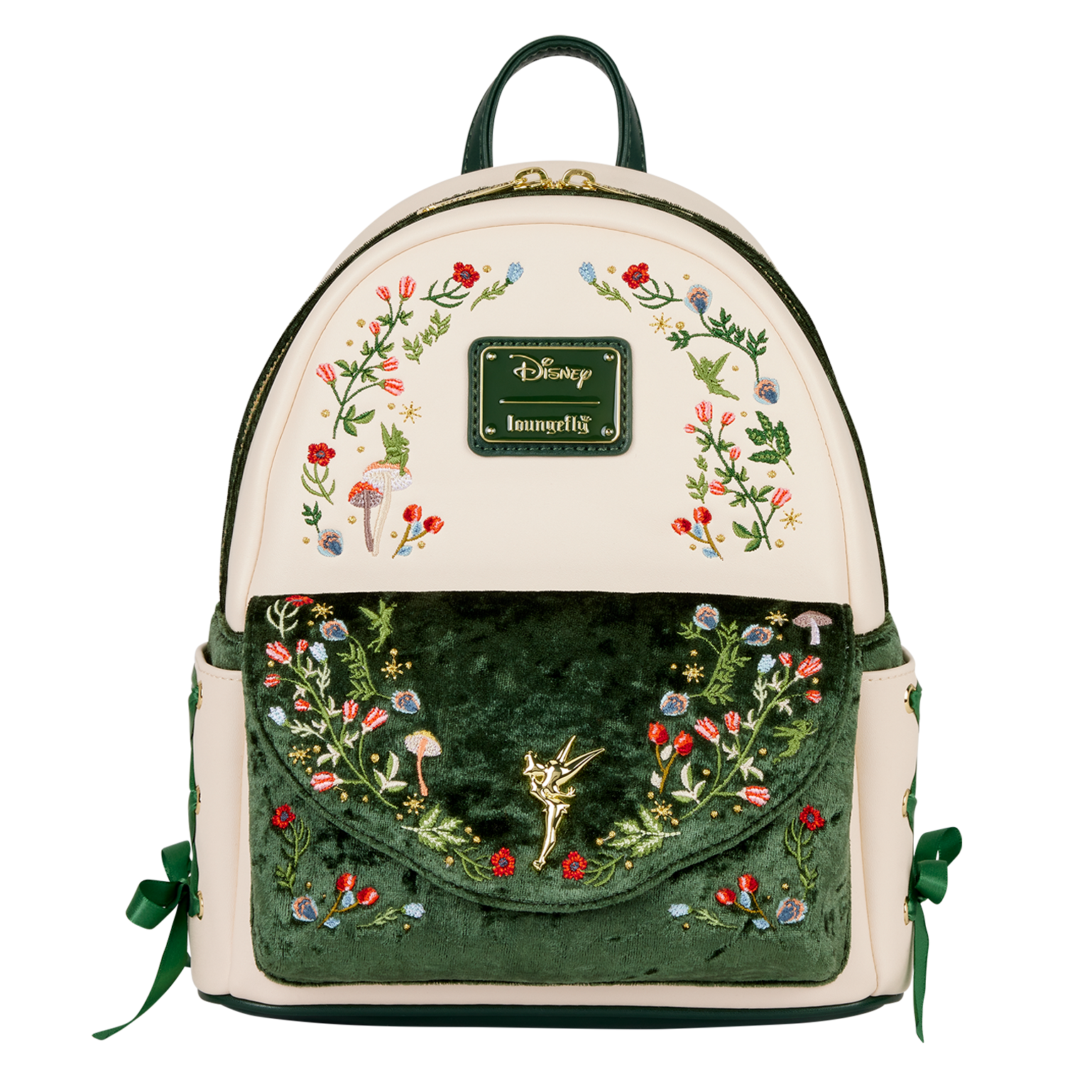 This mini backpack is inspired by Tinker Bell! You’ll find a golden metal charm of her on the front pocket against a green velvet background and embroidered floral designs. More floral details are embroidered above the front pocket. And to make this mini backpack extra special, there are real satin ribbons laced through the side pockets!