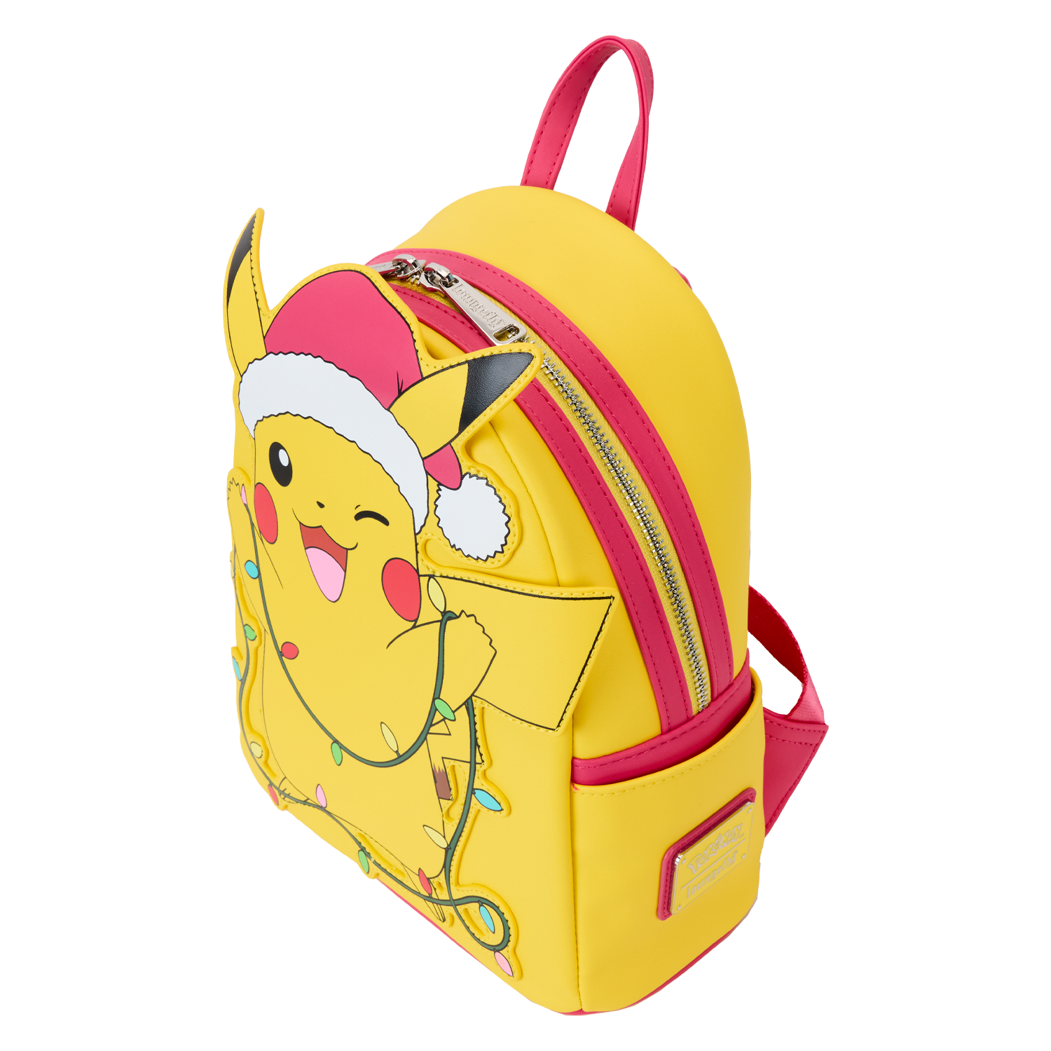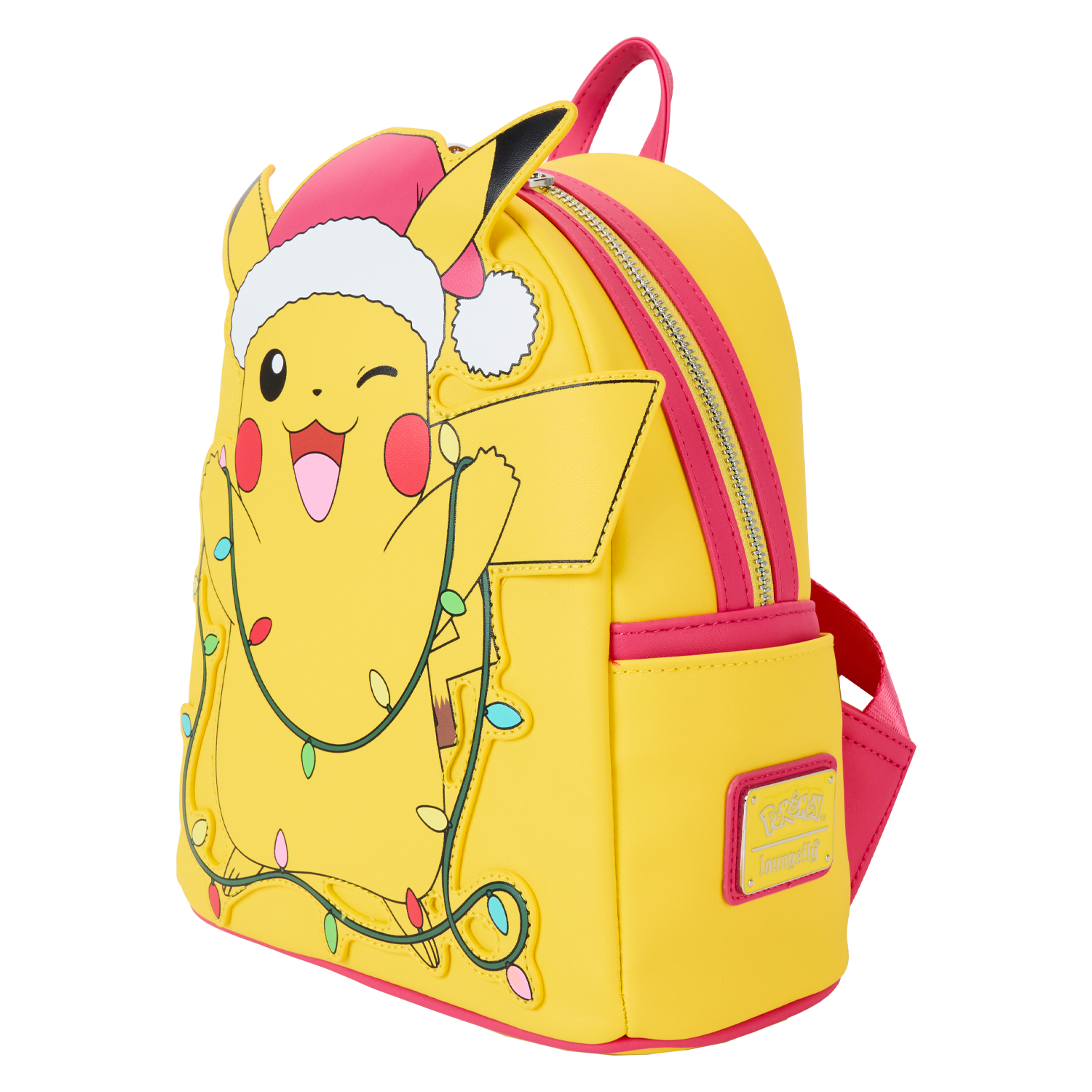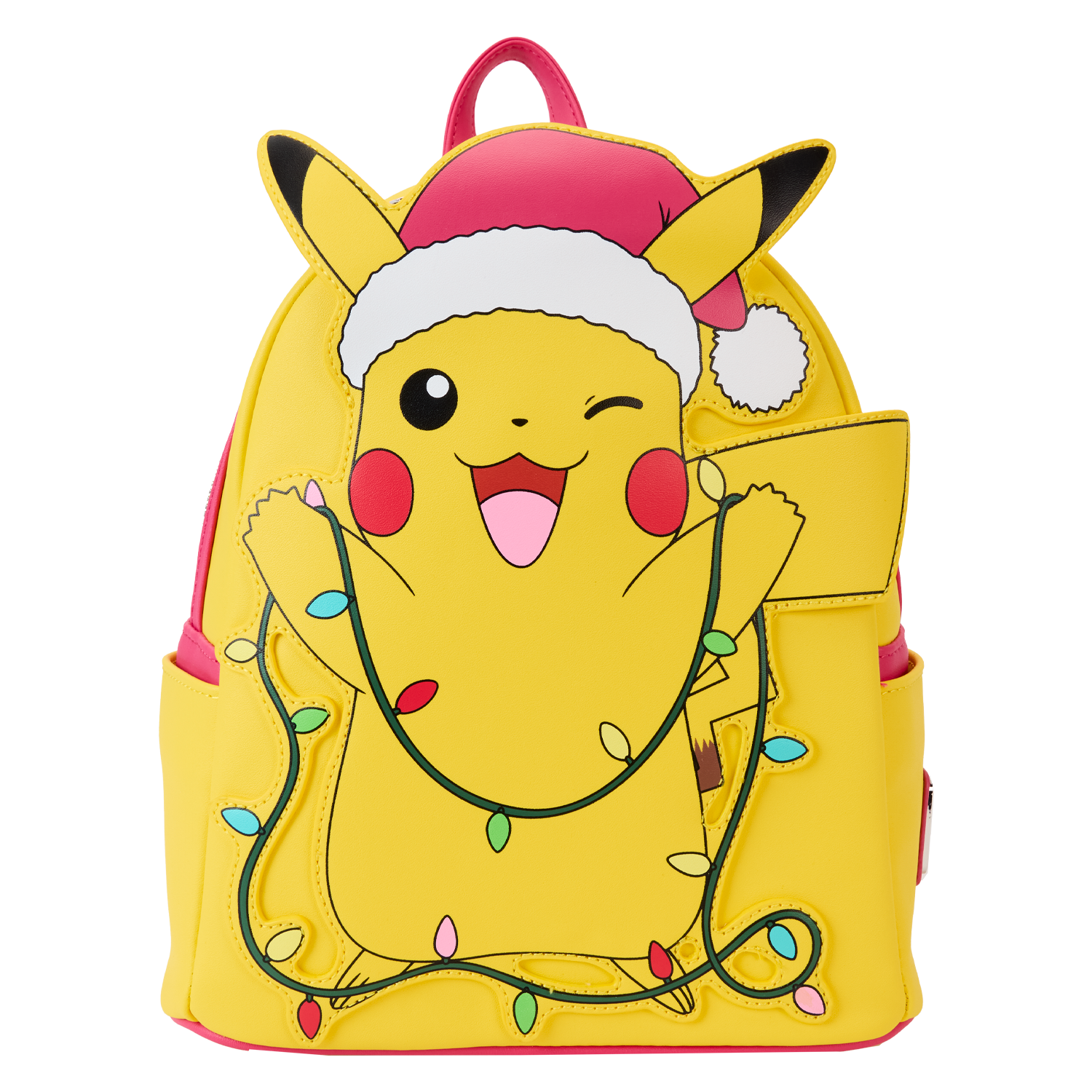 Warm winter wishes for a bright and shining holiday! Pikachu is ready to join your festivities as he appears on this mini backpack. Dressed in a red hat, he holds a strand of colorful lights that illuminate with light-up features. Add this accessory to your merrymaking fun for a cheerful twist on winter traditions!
