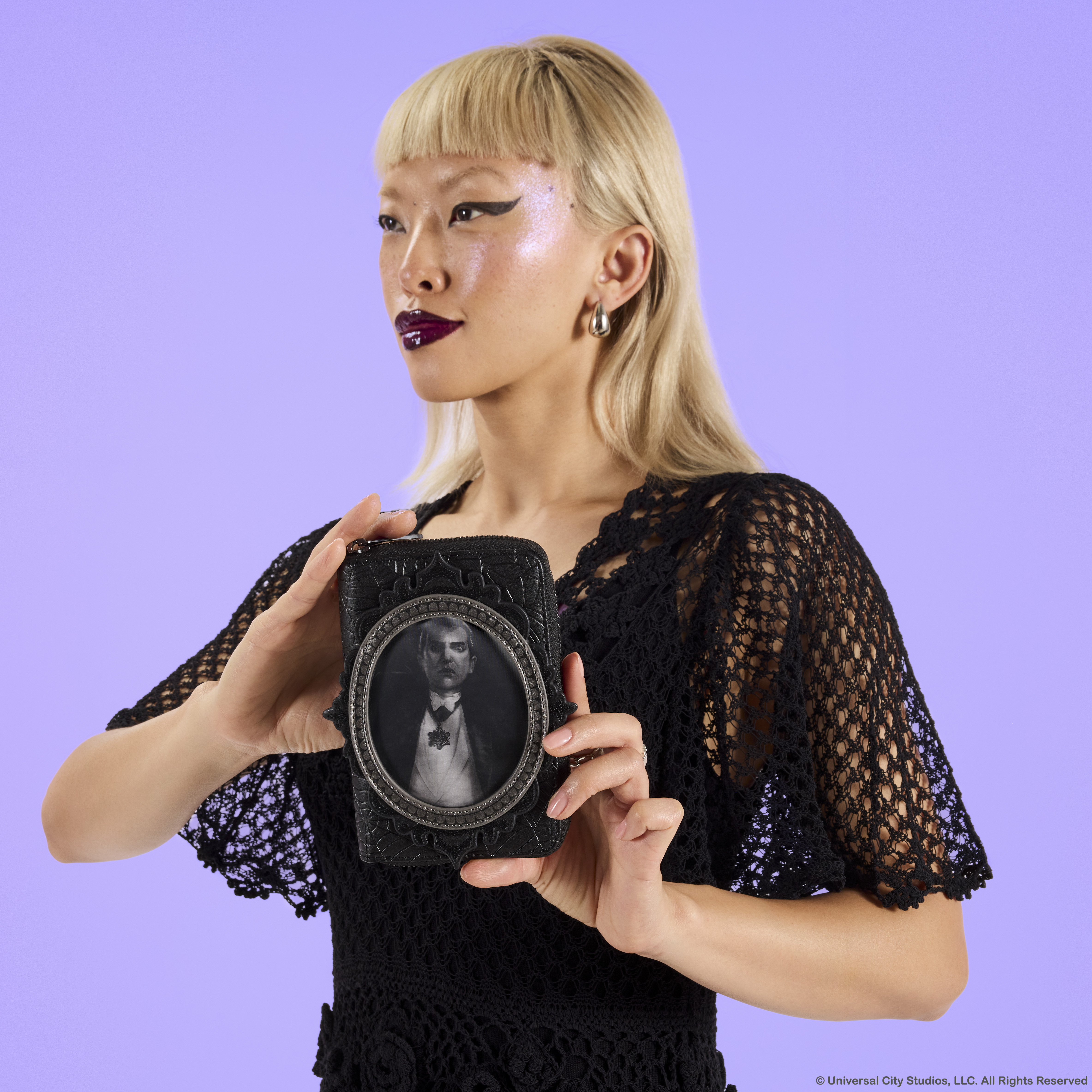 The front of the wallet features a cameo-style frame. Within it is a lenticular panel that shows different portraits of classic Universal Monsters, like Frankenstein, the Creature from the Black Lagoon, Dracula, and the Mummy! Inside, there are four card slots and one clear slot for an ID.