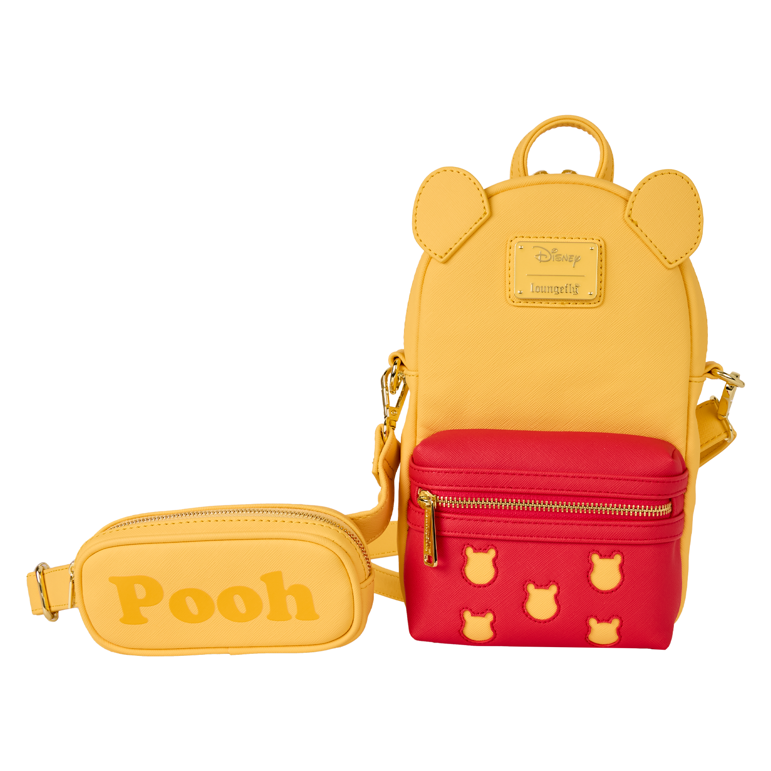 This sling bag is inspired by Winnie the Pooh. It follows a similar style to our mini backpacks, featuring a front pocket and a main zippered compartment. You'll find 3D ears sticking out from the top. The front pocket is red and features an all-over pattern of Pooh’s silhouette! Attached to the crossbody strap is a coin bag that says "Pooh" on it!
