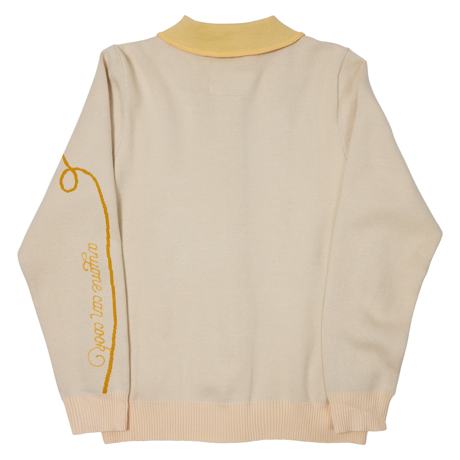 Jacquard art and embroidery bring the design to life. Remy's silhouette is in the lower corner. A swirling design connects him to the rest of the art on the cardigan: an outline of the Eiffel Tower and the embroidery on the sleeve that reads, "Anyone can cook."