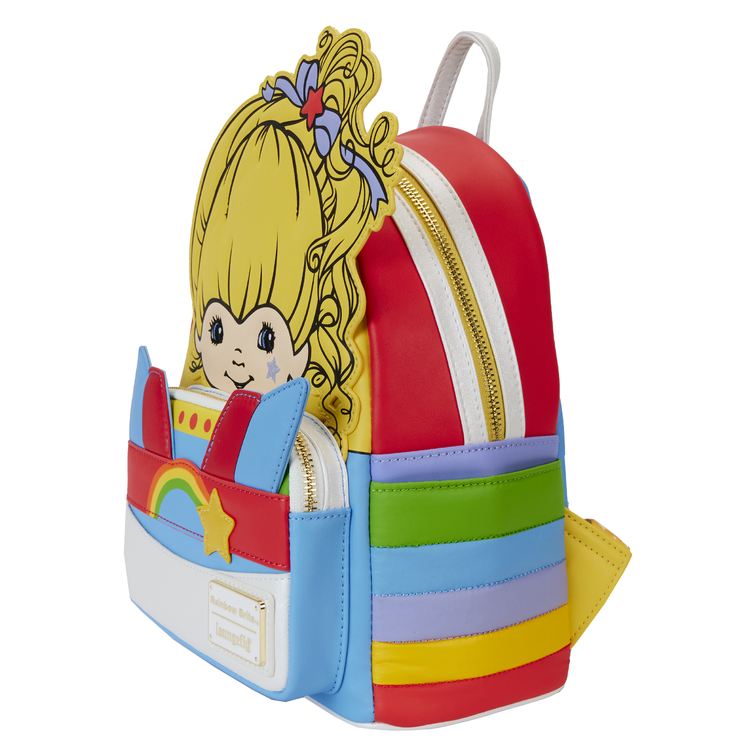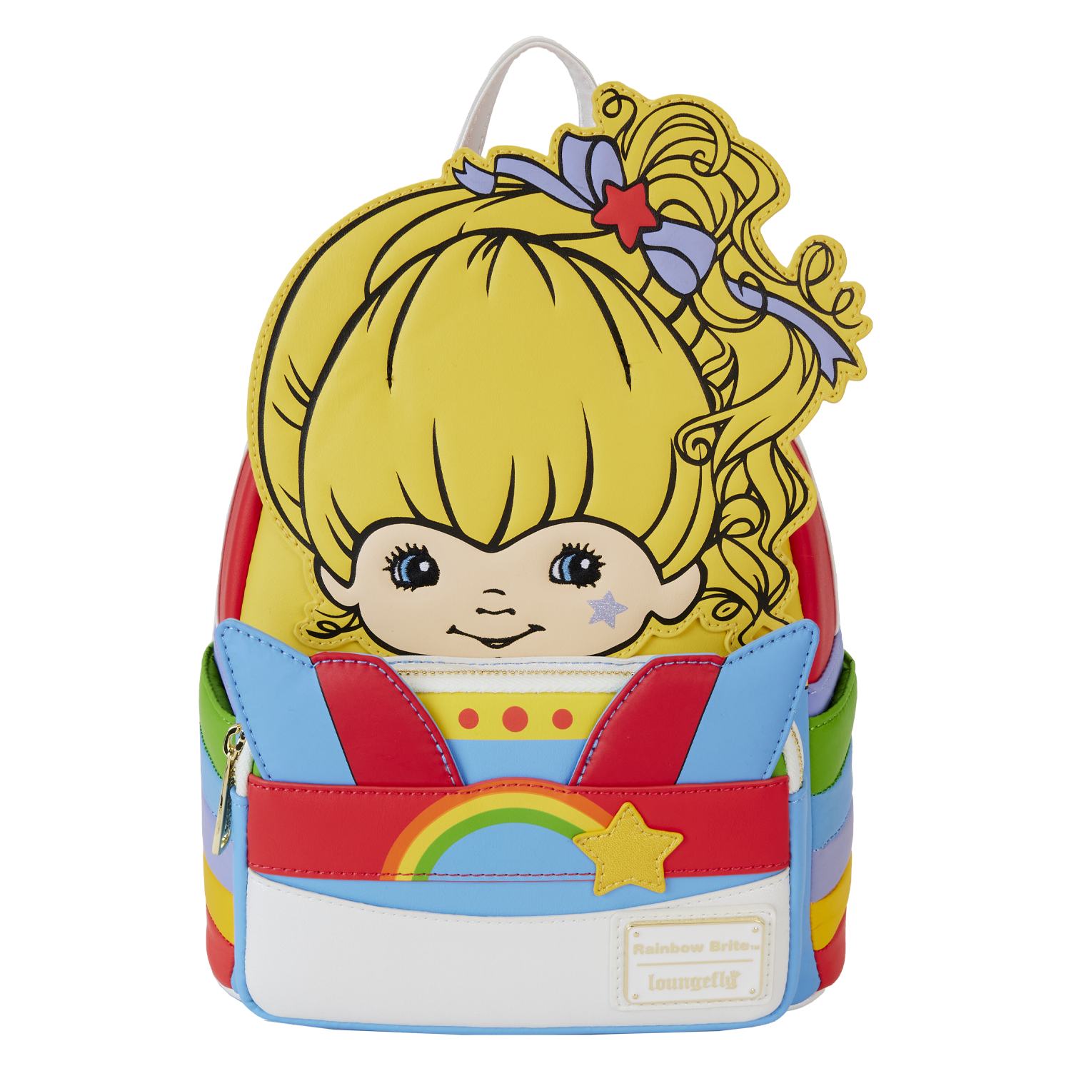 The power of the rainbow is yours! Bring color and happiness wherever you go with the Loungefly Rainbow Brite™ Cosplay Mini Backpack. On the front, Rainbow Brite comes to life with embroidered facial features and an iridescent star on her cheek. Her dress continues onto the zipper pocket below, where her Color Belt cinches her outfit together. The stripes of Rainbow Brite’s sleeves appear on the bag’s side pockets, and Rainbow Brite appears with Twink on the bag’s back. Star Sprinkles accompany the backpack’s rainbow-striped shoulder straps, completing the look with an extended burst of color. This accessory makes a shining addition to any outfit and is sure to fight off any forces of darkness and gloom.