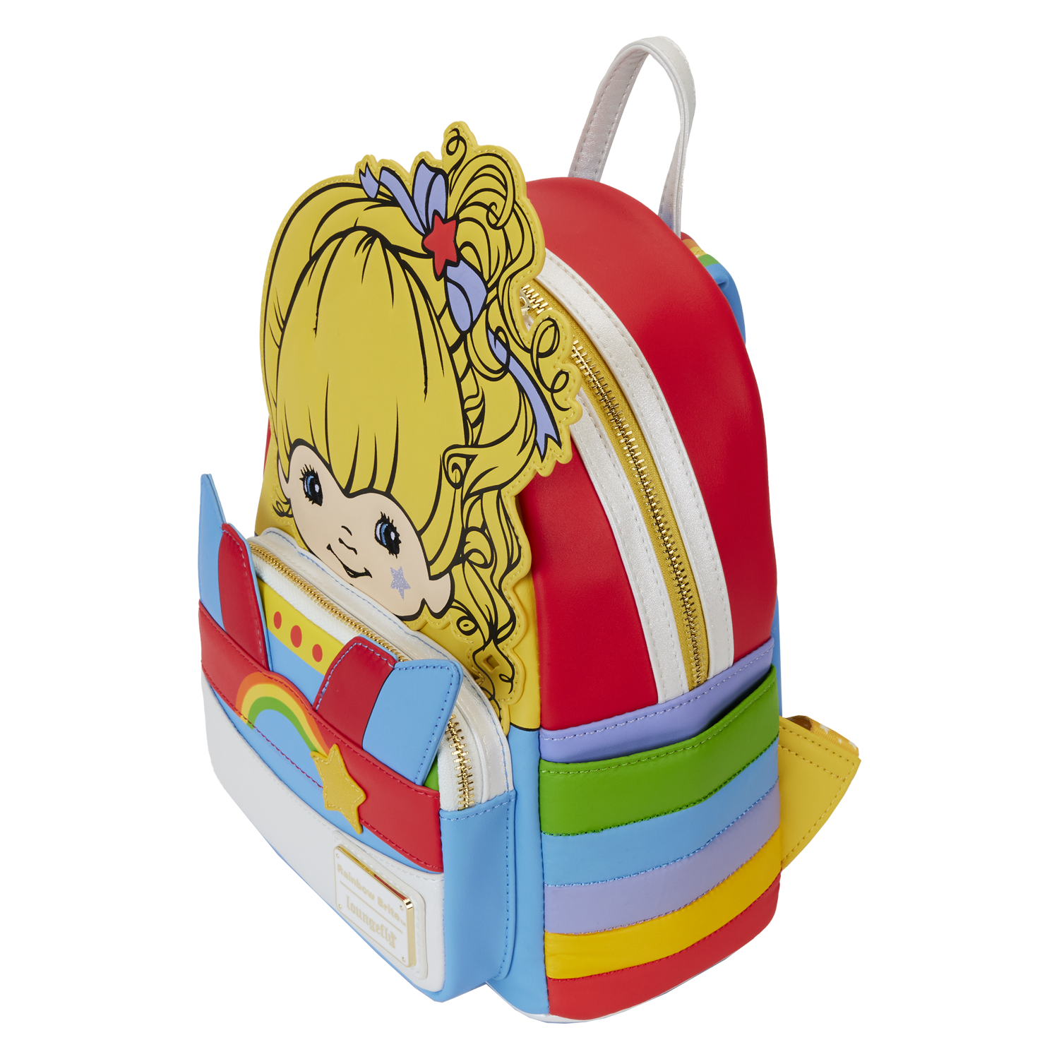 The Loungefly Rainbow Brite Cosplay Mini Backpack is made of vegan leather (polyurethane). Bag has adjustable shoulder straps and shiny gold hardware. Additional features include applique, embossed, iridescent, glitter, embroidered, padded, and printed details. Take note of the coordinating inside lining.