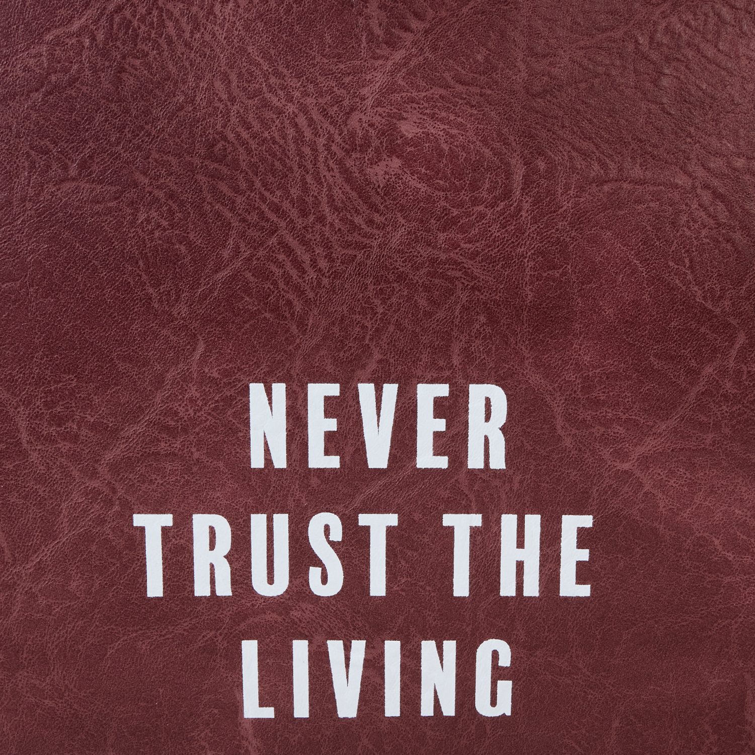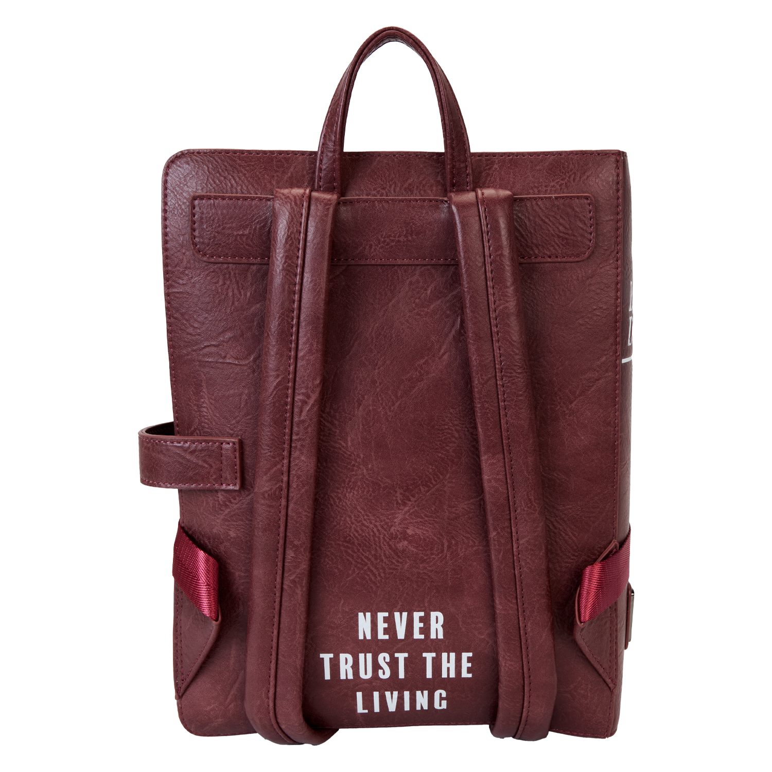 Book a trip for a spirited good time! Make a fashionable escape with our Beetlejuice: Handbook for the Recently Deceased Trader Pin Backpack. This functional and versatile backpack features a pin-trading “page” that’s perforated for storing and displaying your favourite pins. A front-flap strap secures the front “cover,” which features embroidered letters spelling out “Handbook for the Recently Deceased.” A clear material creates a shiny, laminated effect for viewing the artwork on the front cover. Just like the book in the movie, the “cover” for this “book” displays a couple holding hands, preparing to journey into the afterlife. “Weathered” brown faux leather creates an authentic look, and the lettering down the “spine” adds a realistic touch. Also, you can start your collection with an enamel pin of a Sandworm, which comes with this backpack. On the back, white lettering spells out a warning: “Never Trust the Living.” Pack just what you need for the day to visit your favourite haunts in style.