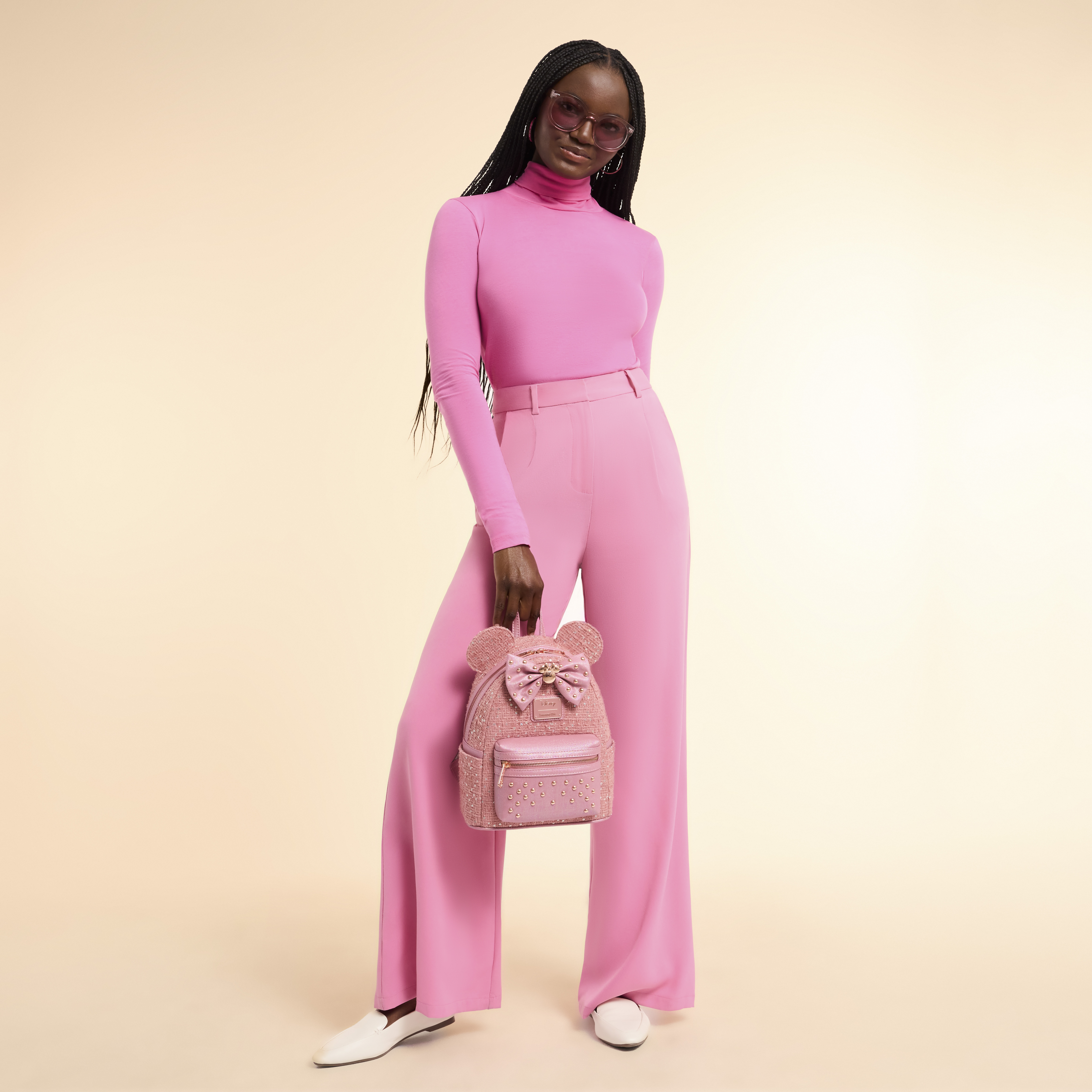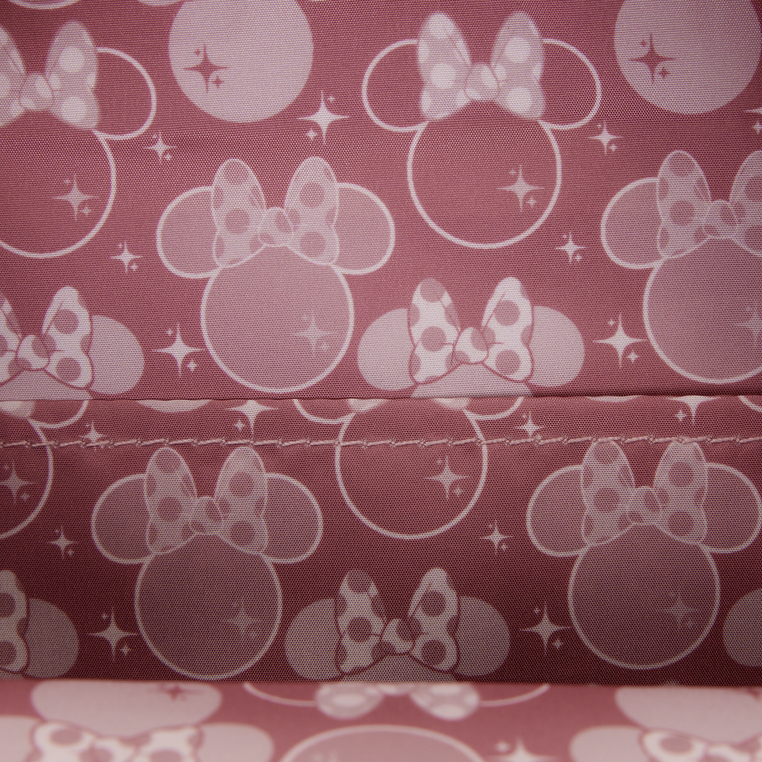 This exclusive mini backpack features sparkle tweed with shimmer faux leather and glitter details! You'll find 3D ears. Between them is a 3D bow featuring a molded metal charm of Minnie Mouse's silhouette in the center. You'll also find molded metal rivets on the bow, too.