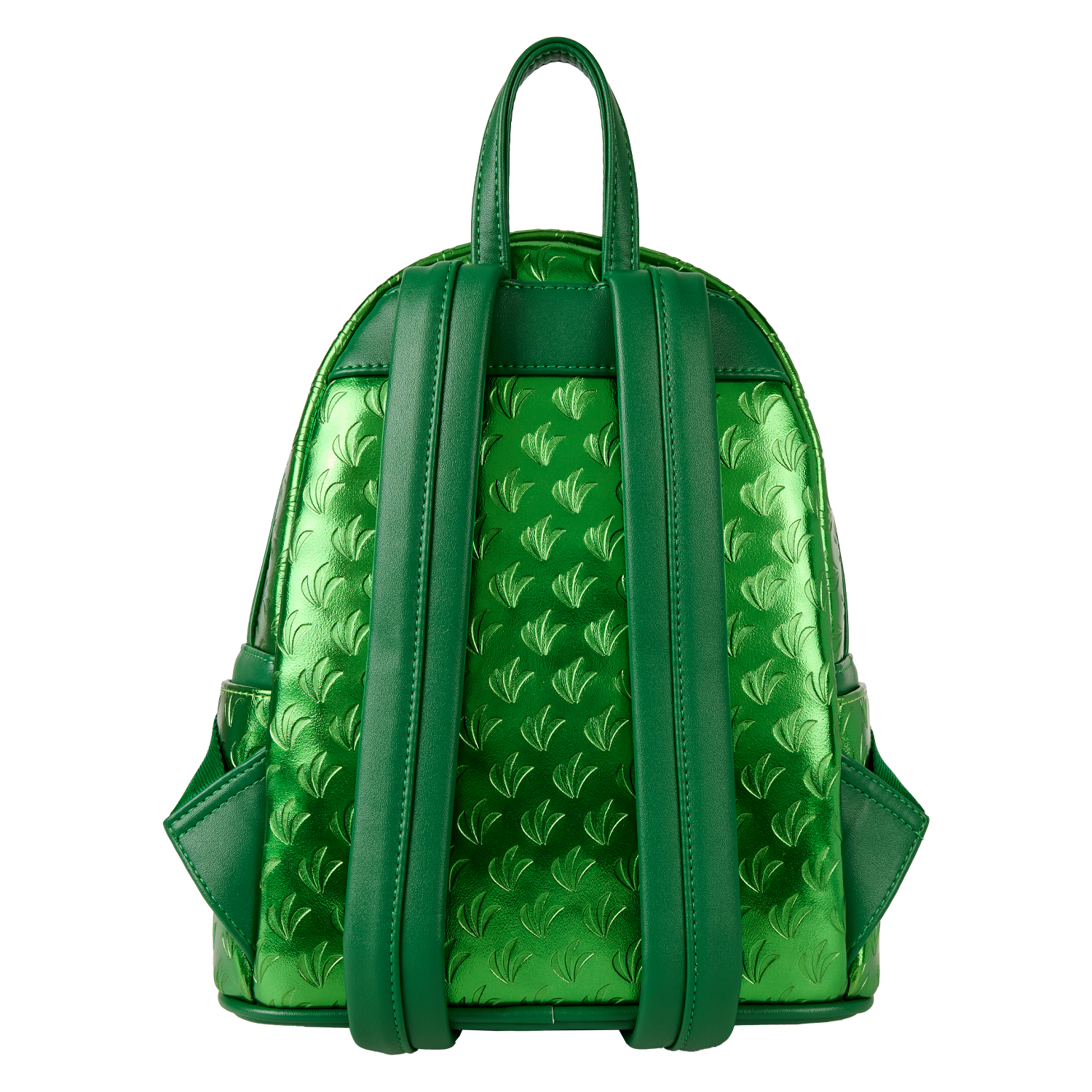 This mini backpack features Bulbasaur on the front pocket. The rest of the bag is made from a metallic green faux leather and features a debossed pattern of grass all over.