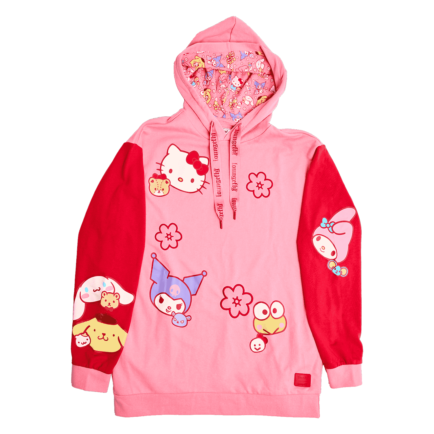 Hello, sweet blossoms! Stop and smell the flowers in style with this Hello Kitty™ and Friends hoodie, featuring a sprinkle of embroidered blooms. Sanrio fans, you’ll find adorable prints of fan-favorite characters and their buddies. Hello Kitty and Tiny Chum appear on the front, along with Keroppi with Teru Teru (Ruby), and Kuromi with Baku. The sleeves are screen-printed, and on them you’ll spot My Melody with Flat on one sleeve, and Cinnamoroll with Bear and Pompompurin with Muffin on the other. Color-blocking in pink and red adds a brilliant touch. Stay cozy as you gather your friends for fun adventures and share smiles wherever you go.